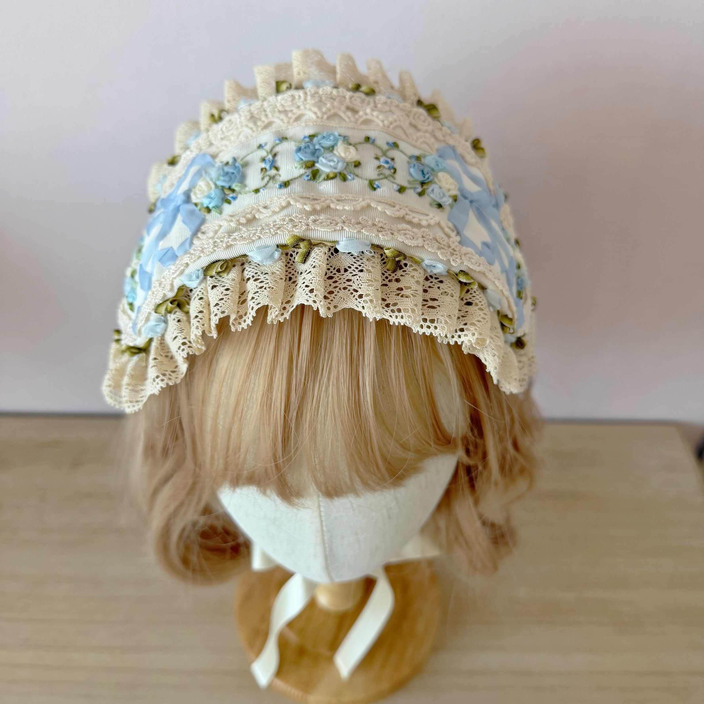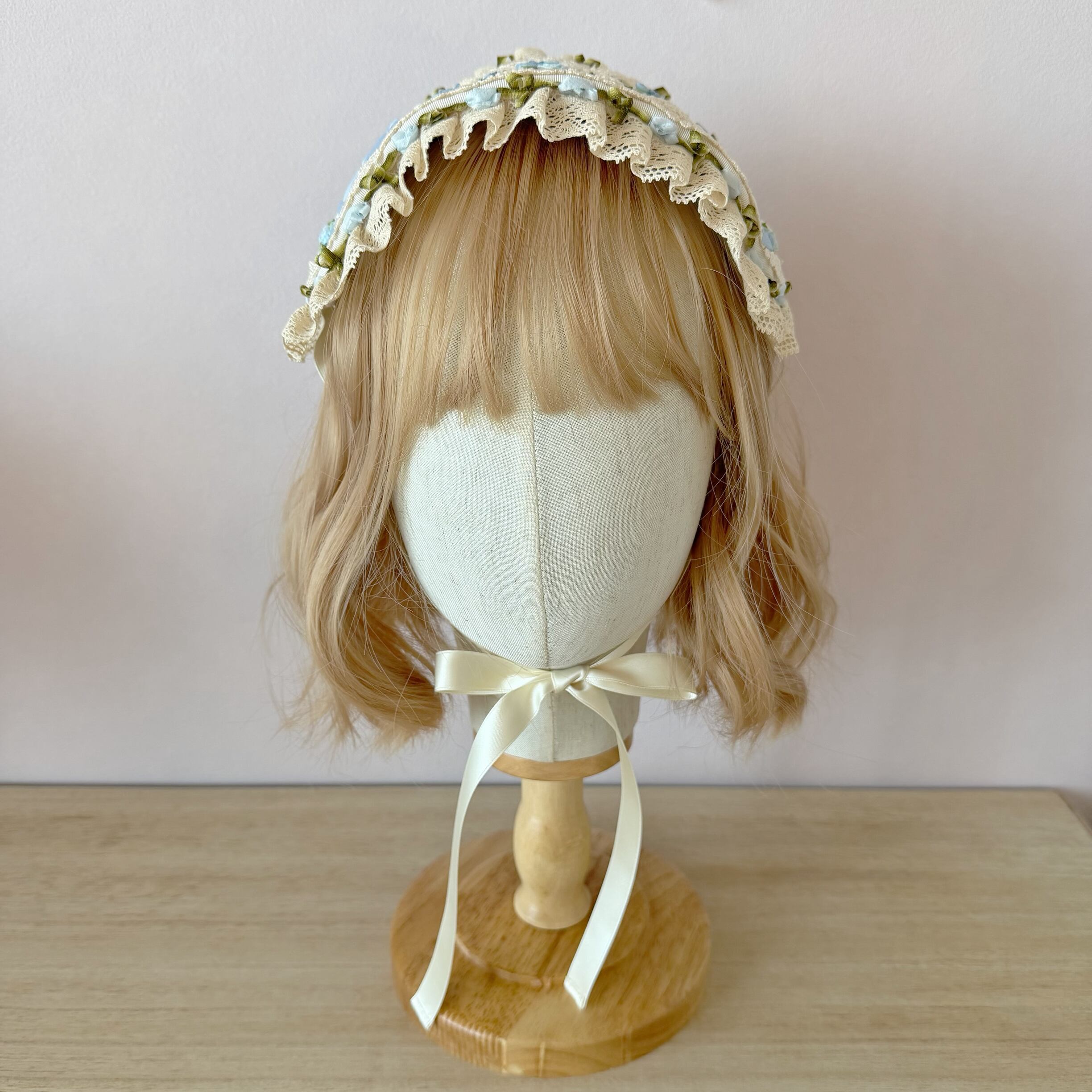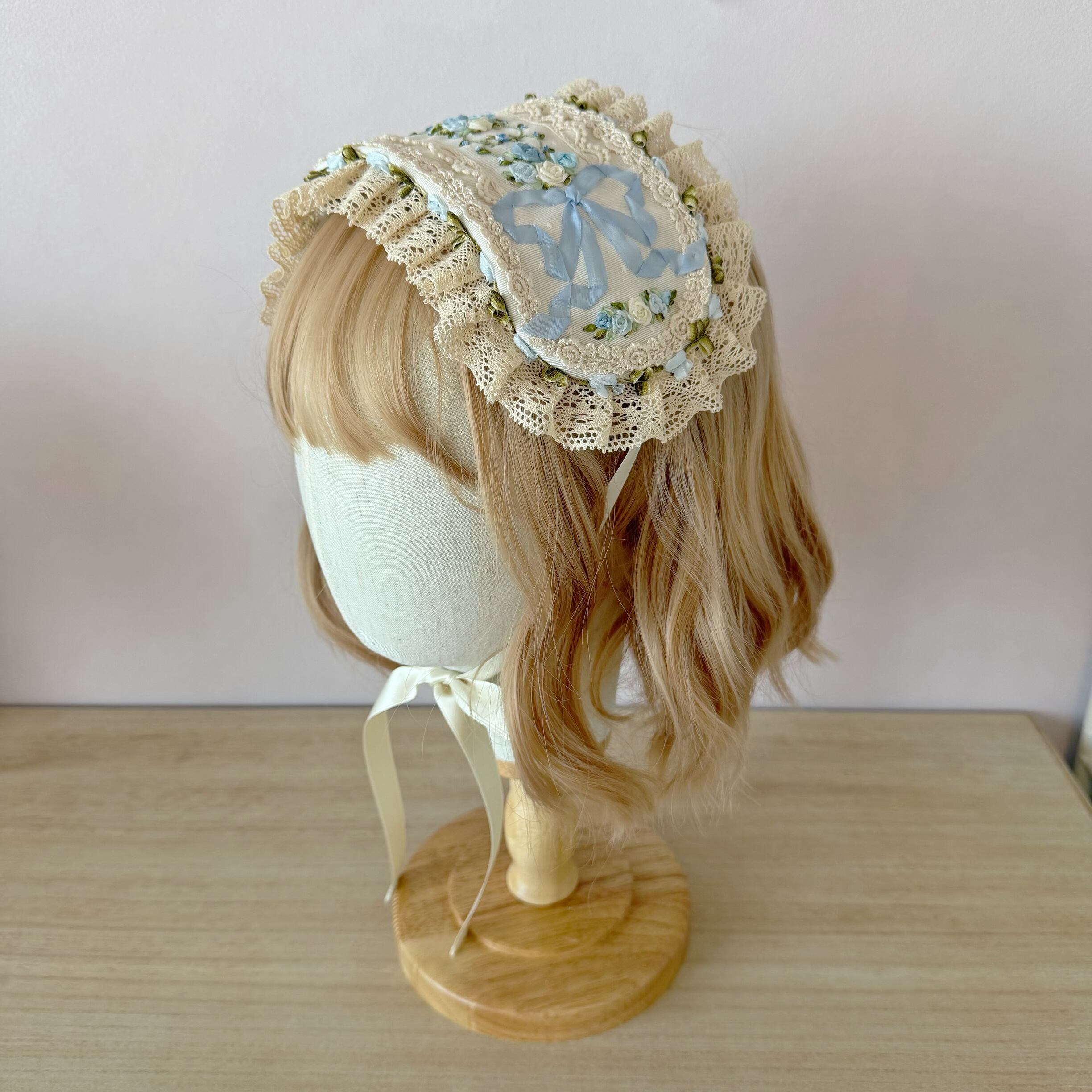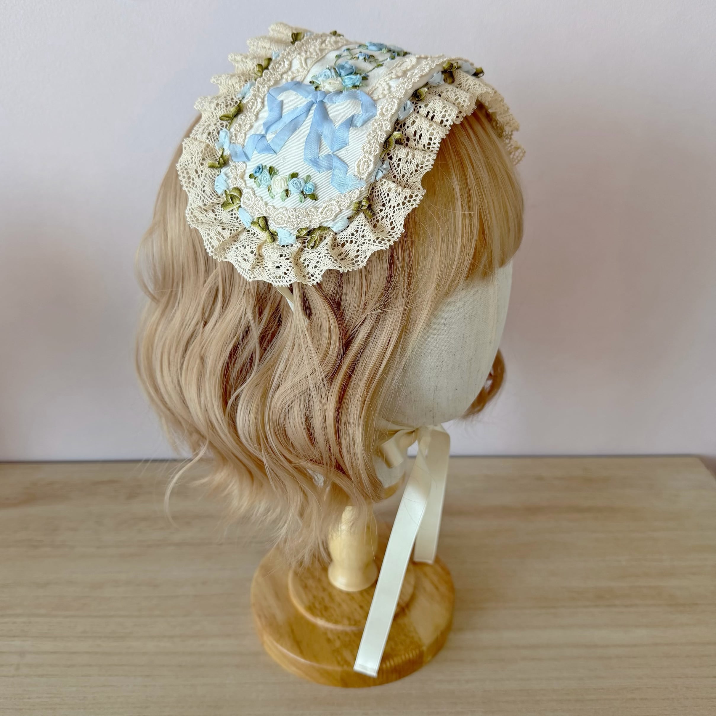 生成りのレースと水色のリボンが、ロココ調の優美なフォルムを形成しています。