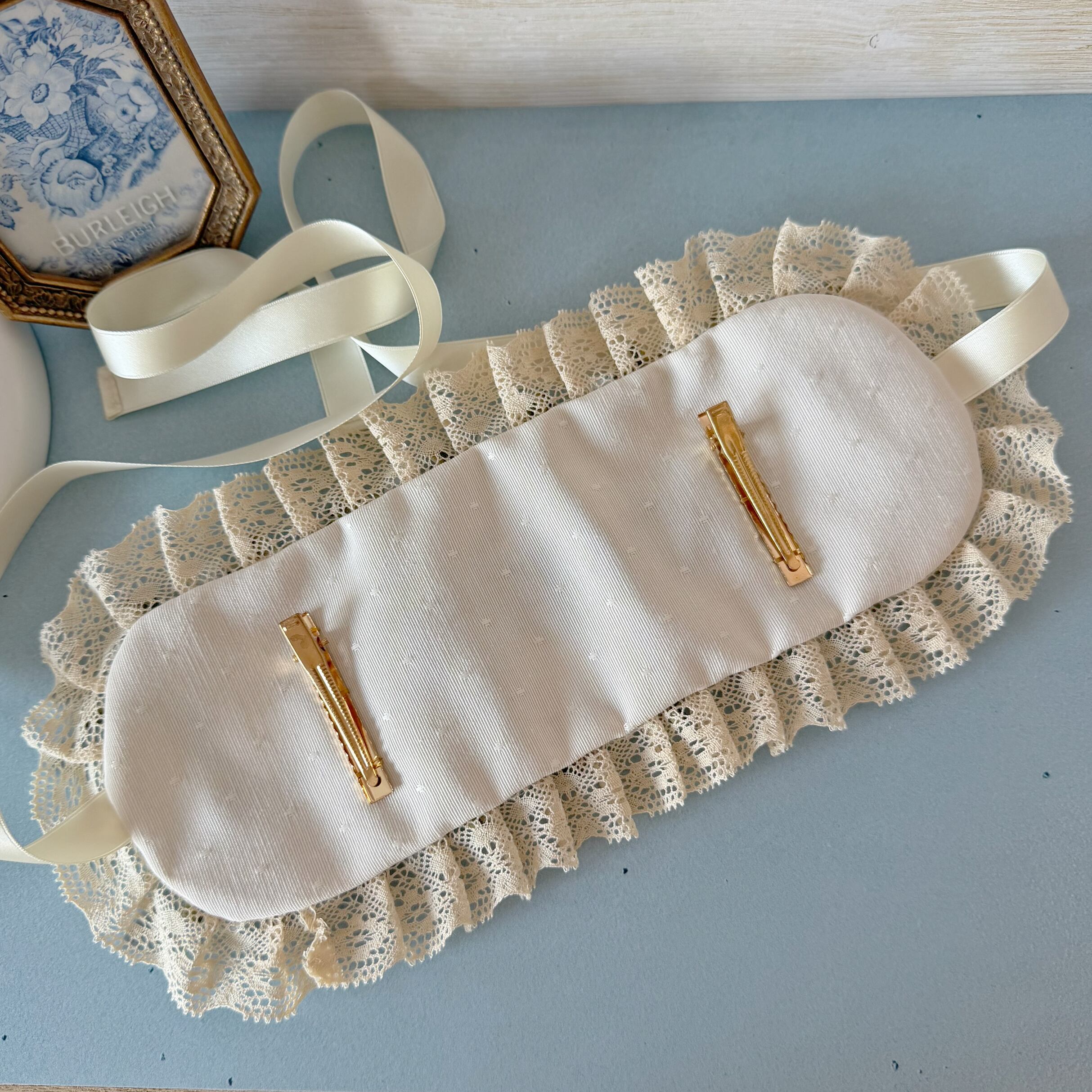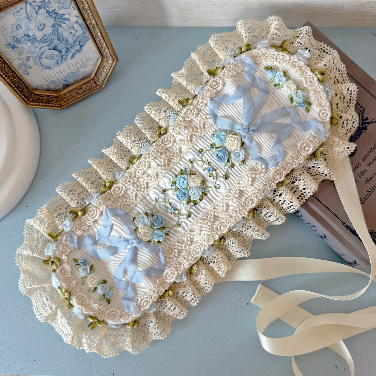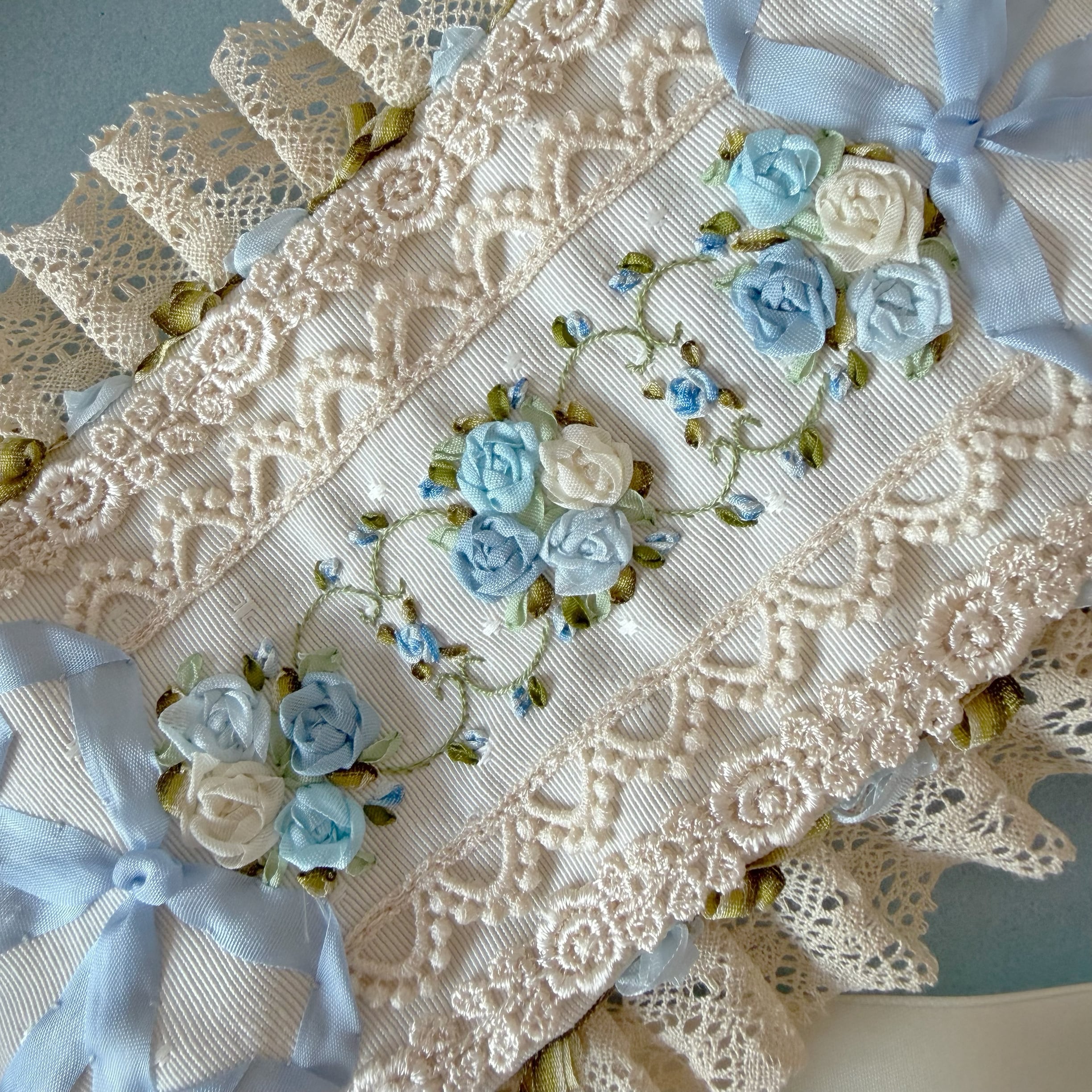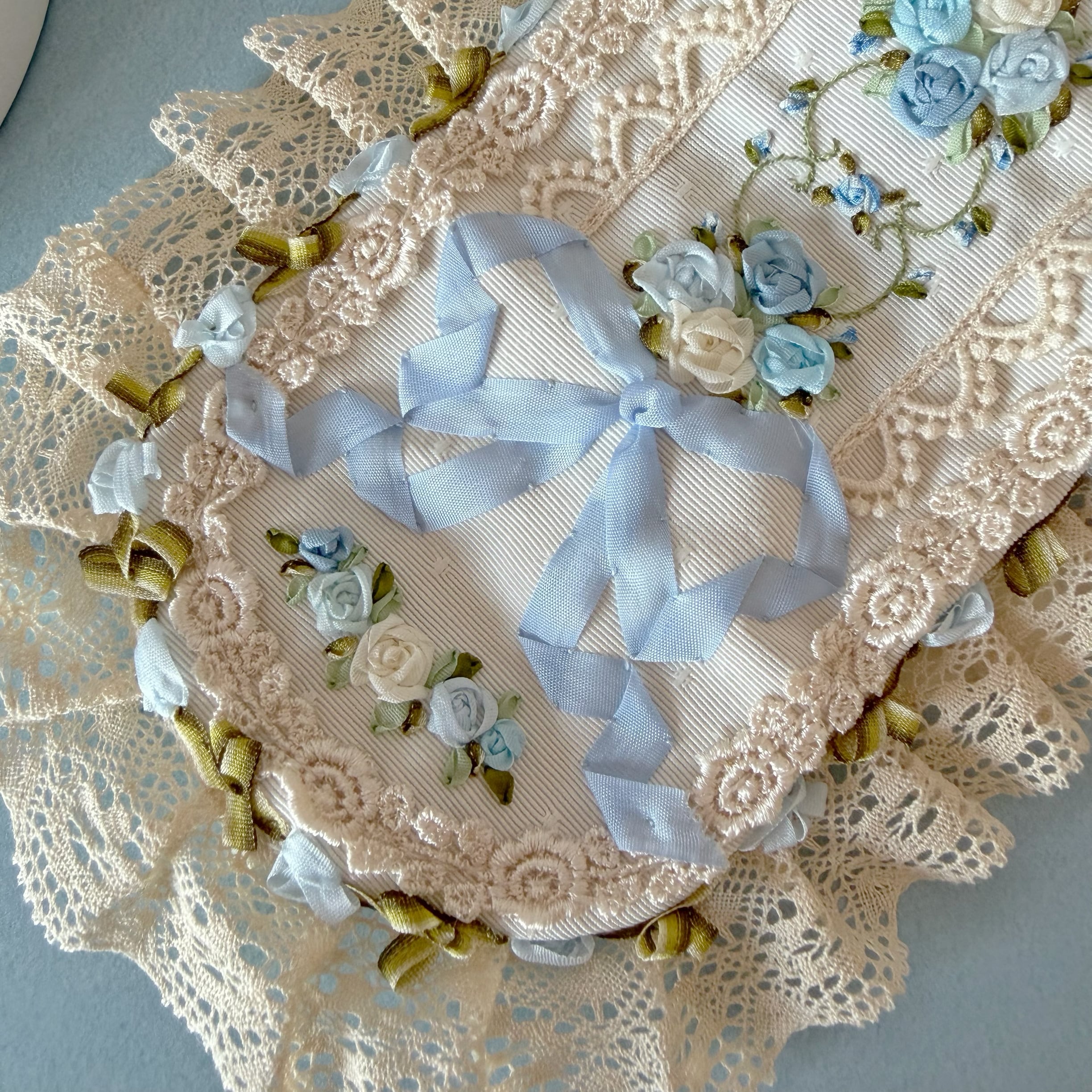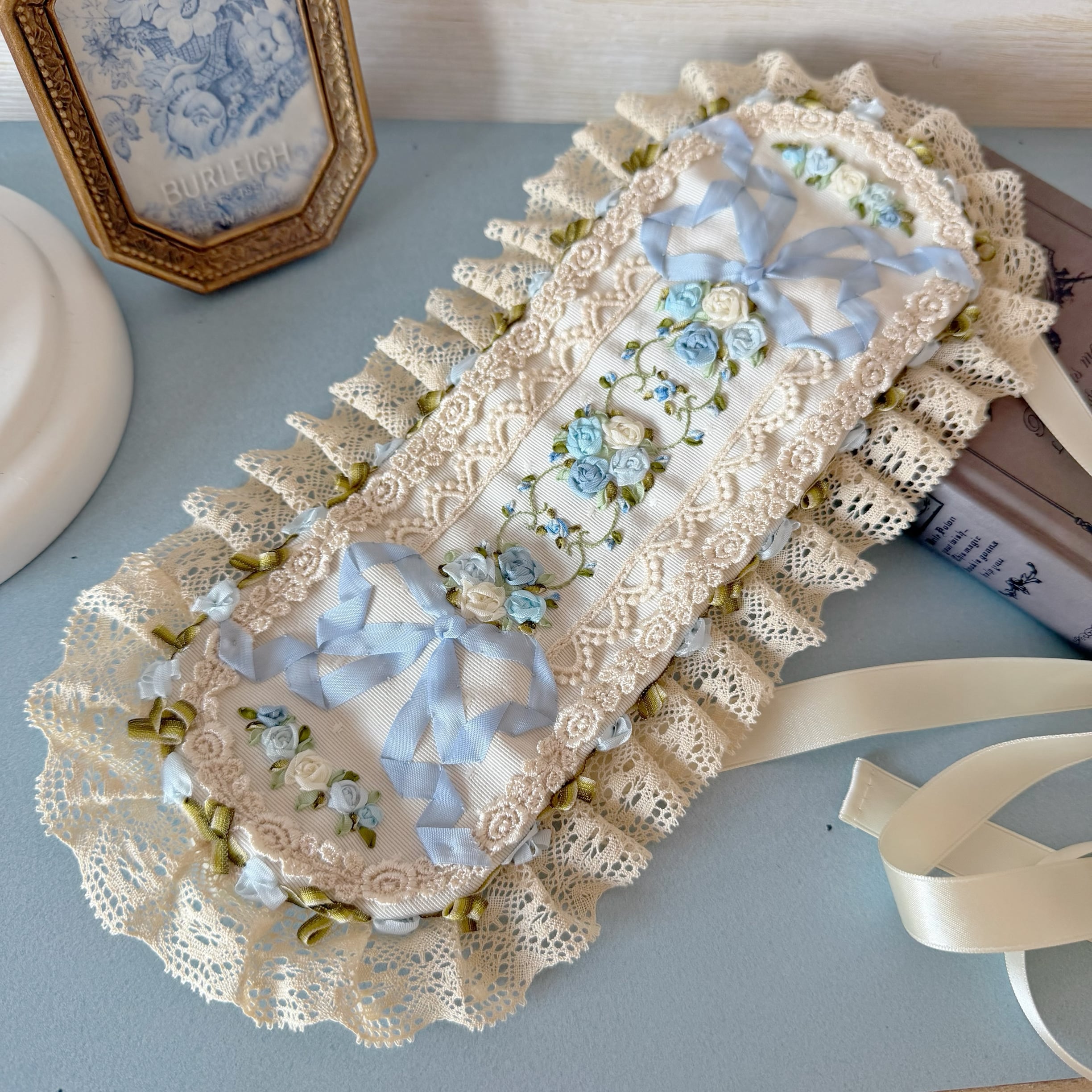 生成りのレースと水色のリボンが、ロココ調の優美なフォルムを形成しています。