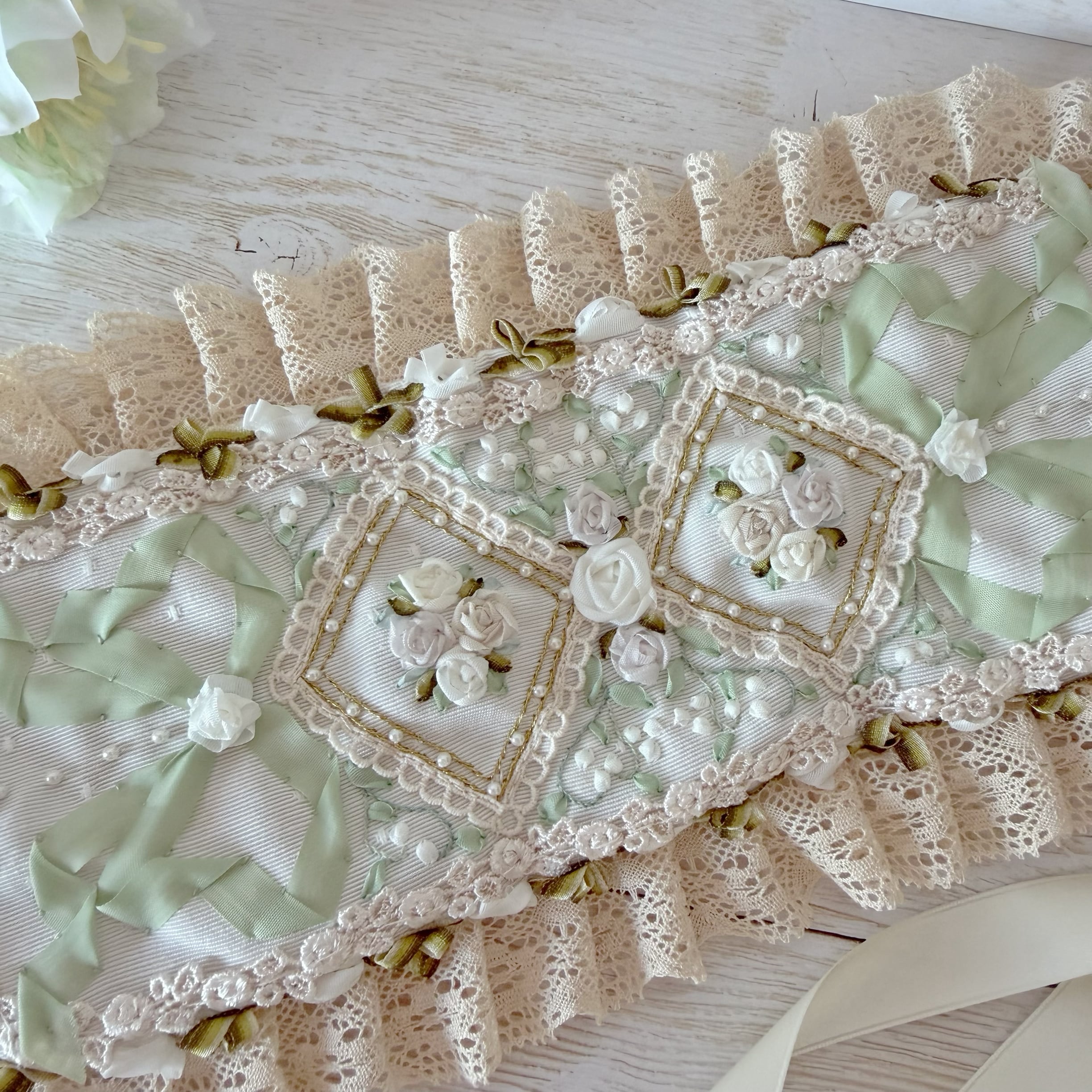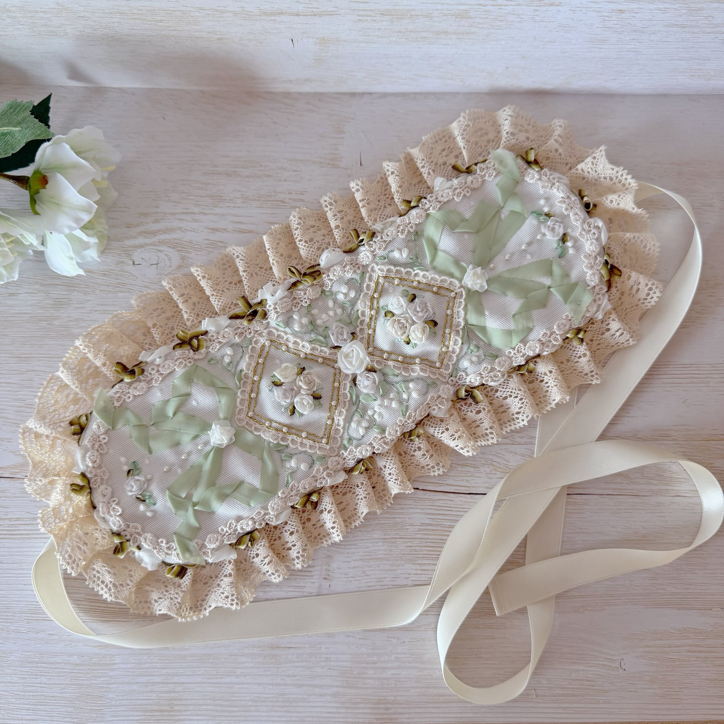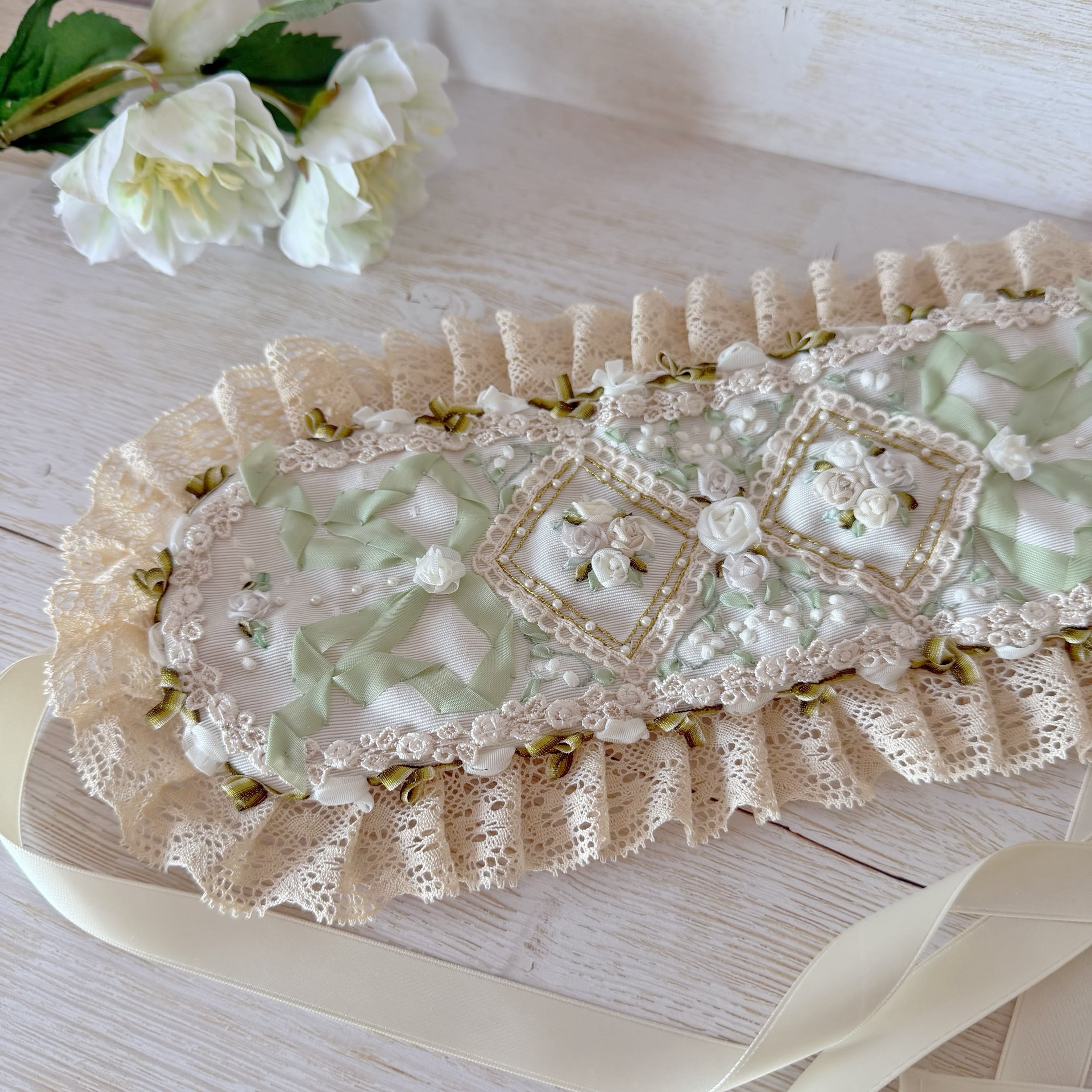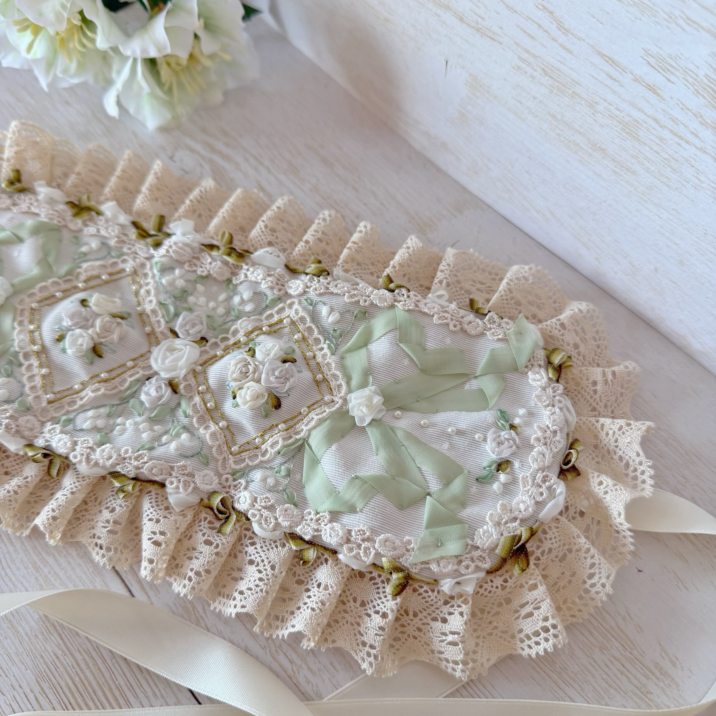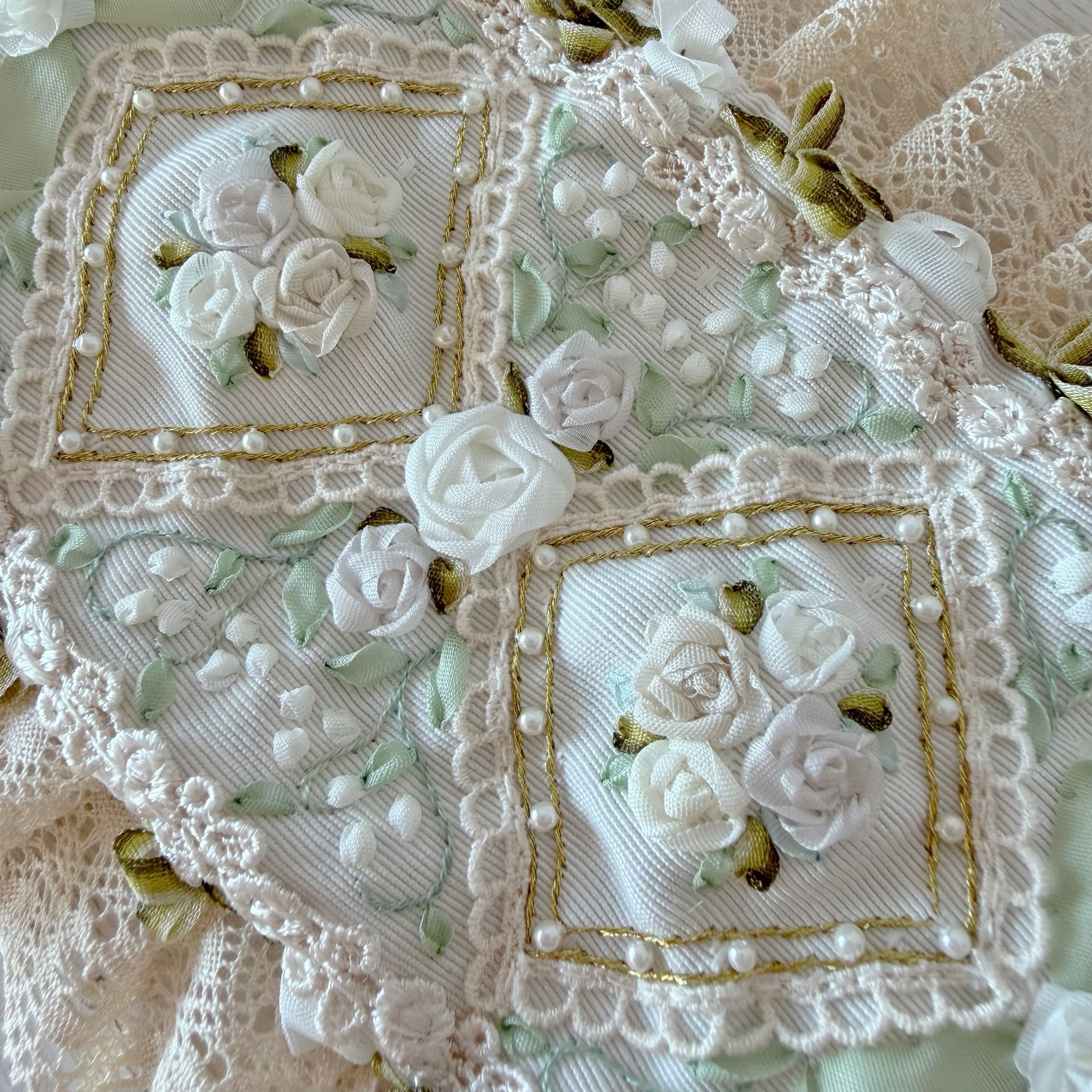 中央の目を引くダイヤの中には立体的な白薔薇、そのまわりに可憐なすずらんをびっしりと丁寧に手刺繍しました。