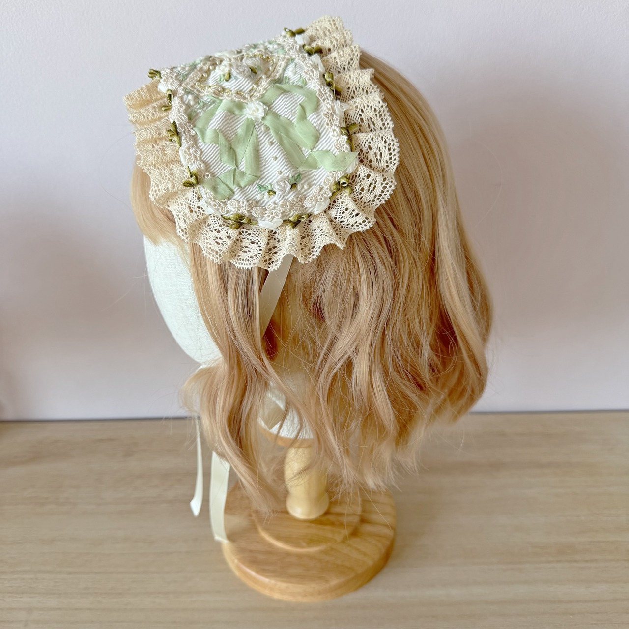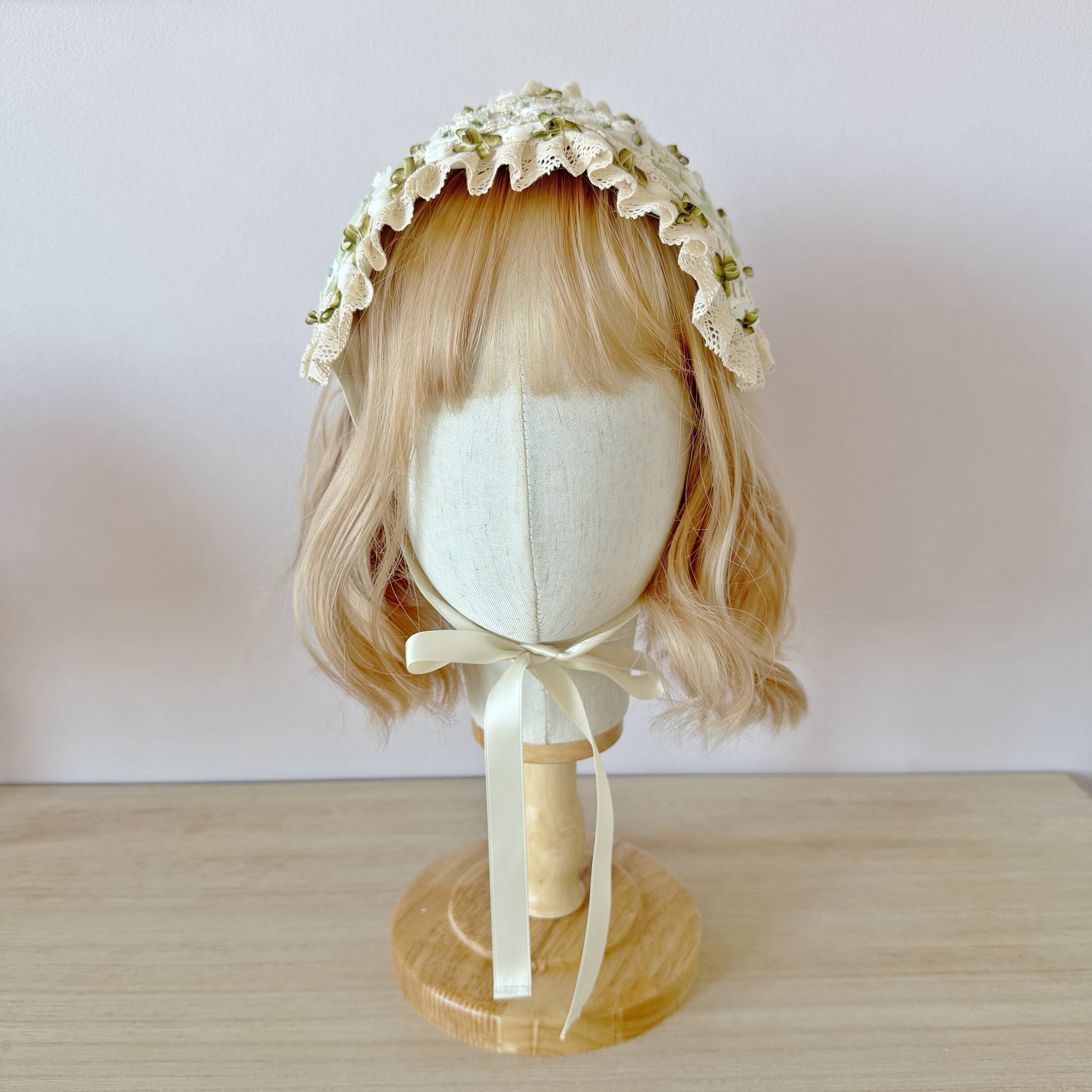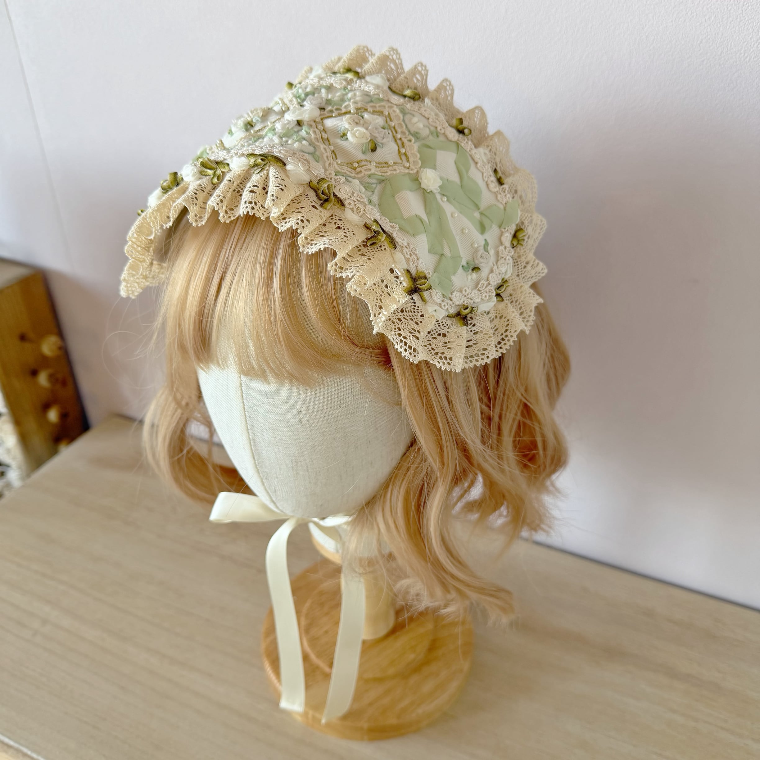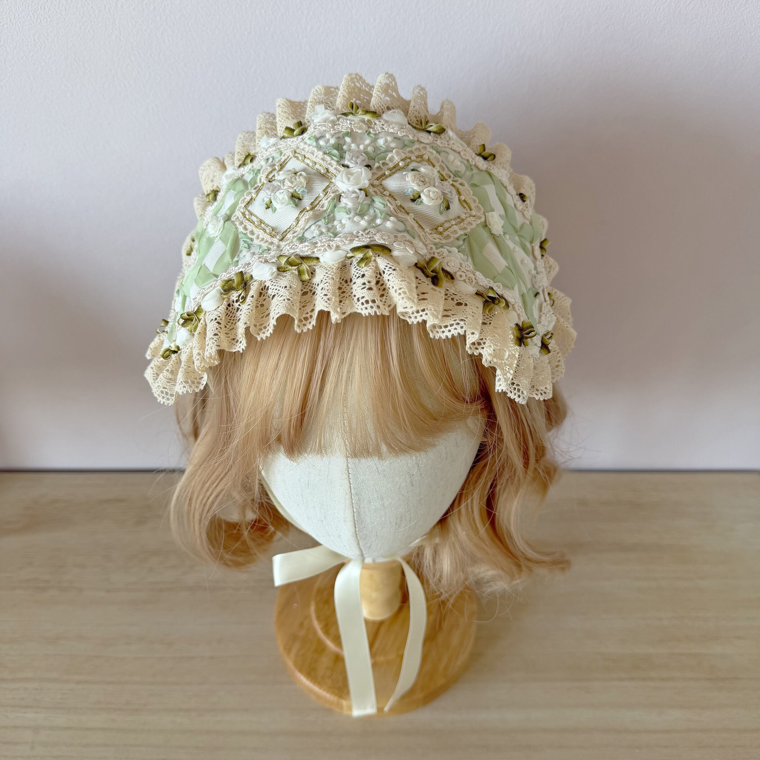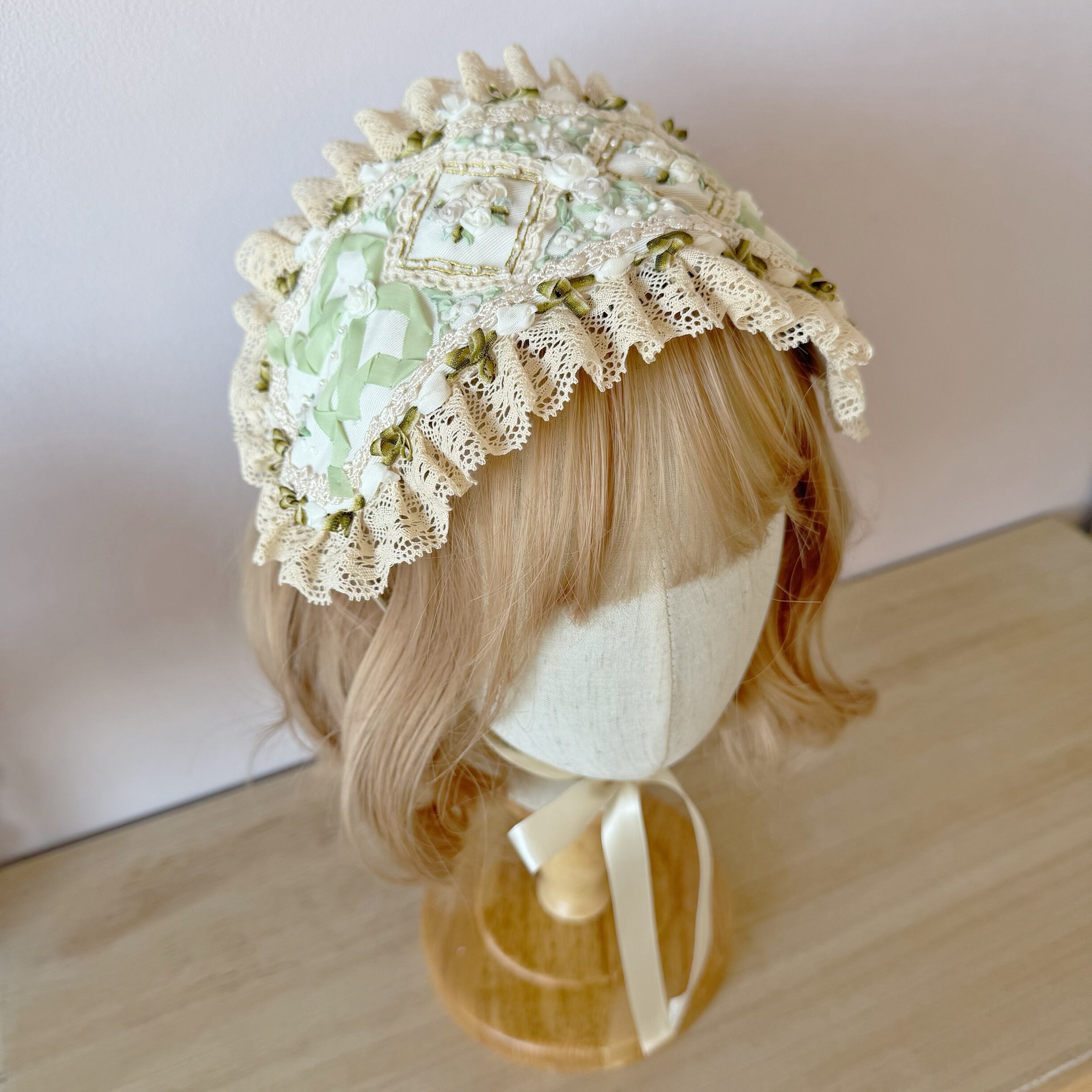 清らかな白と淡いミントグリーンのコントラストが美しい、アンティーク調のヘッドドレスです。