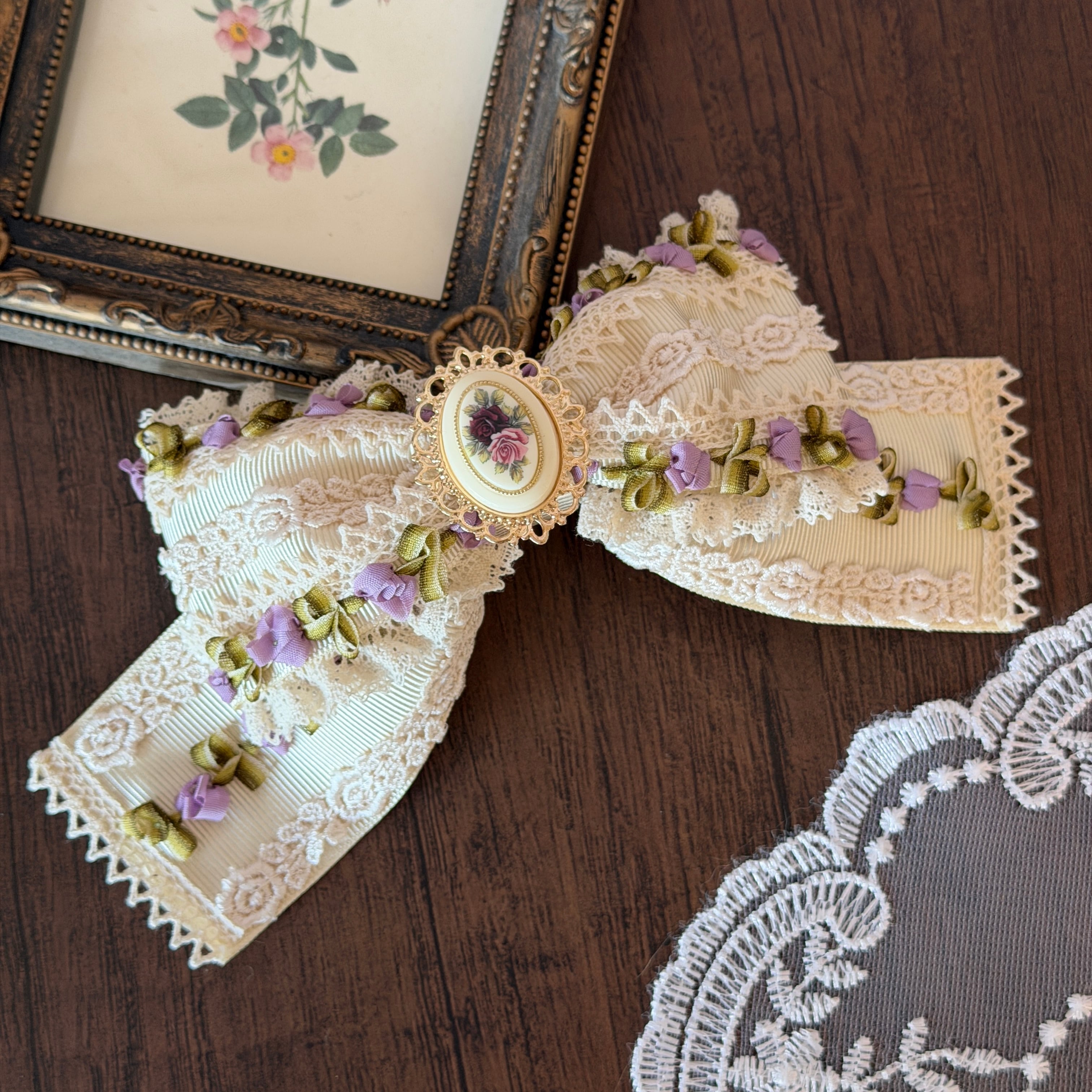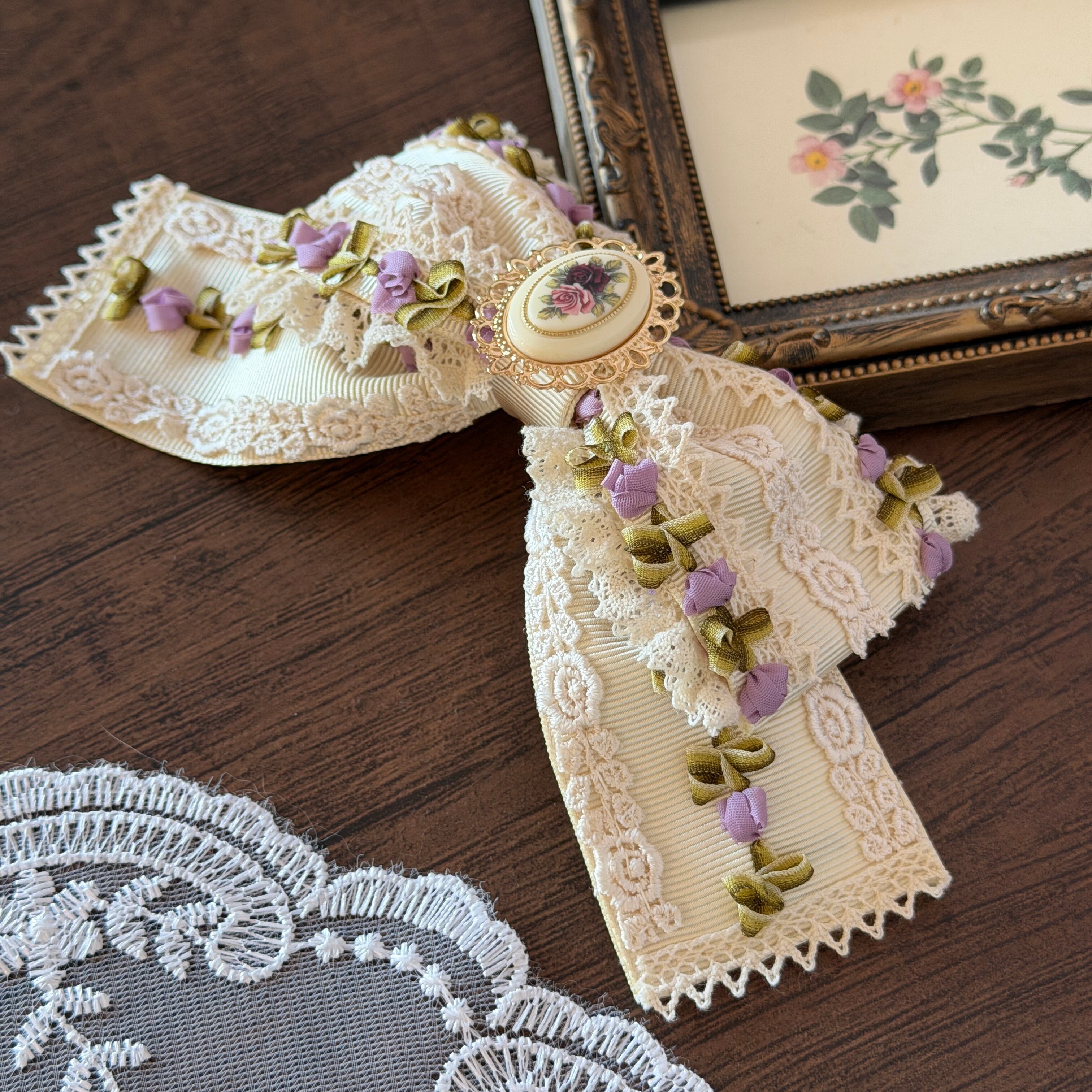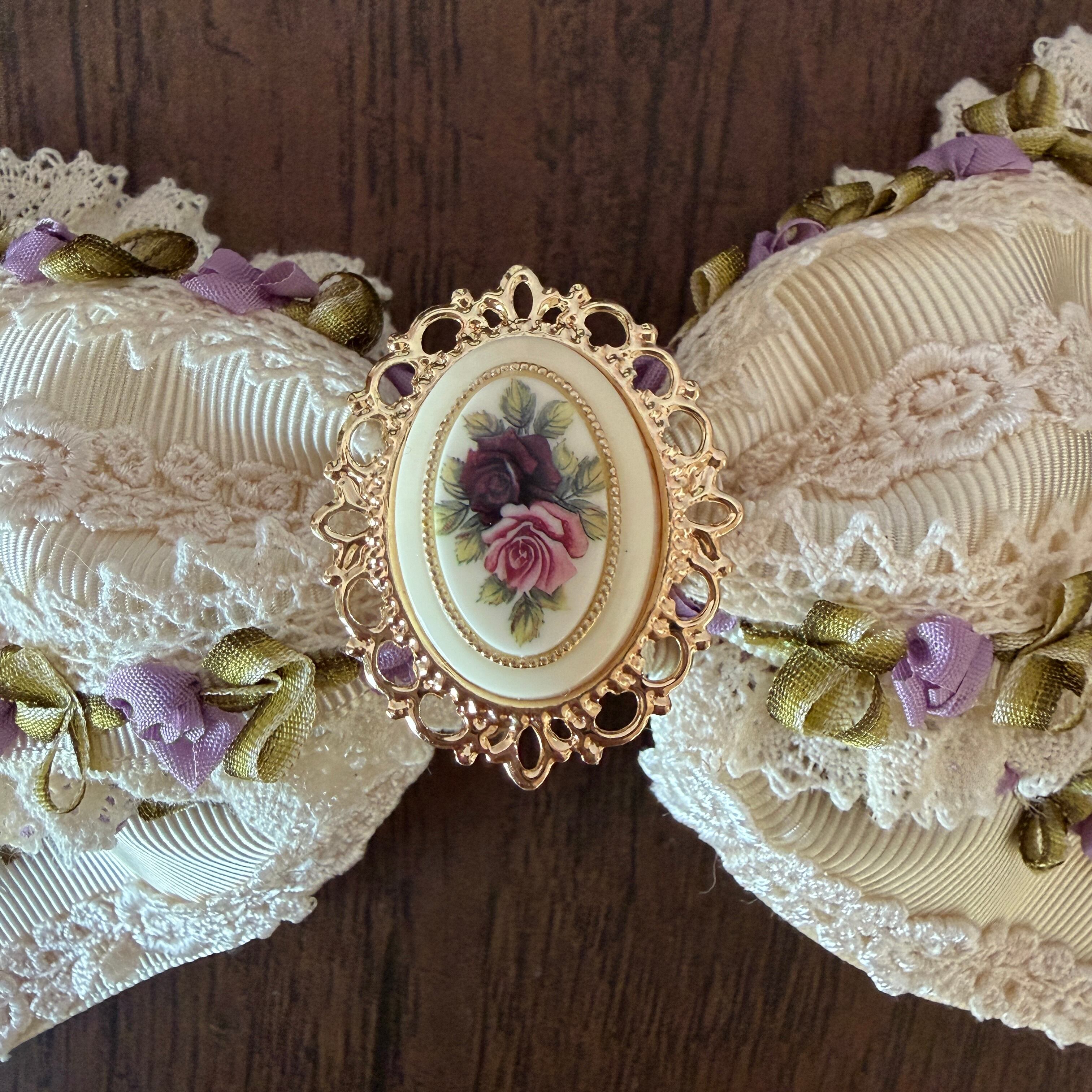 全体にロココトリムと生成りのレースを贅沢にあしらい、中央には象徴的なヴィンテージパーツのカメオを配置しました。