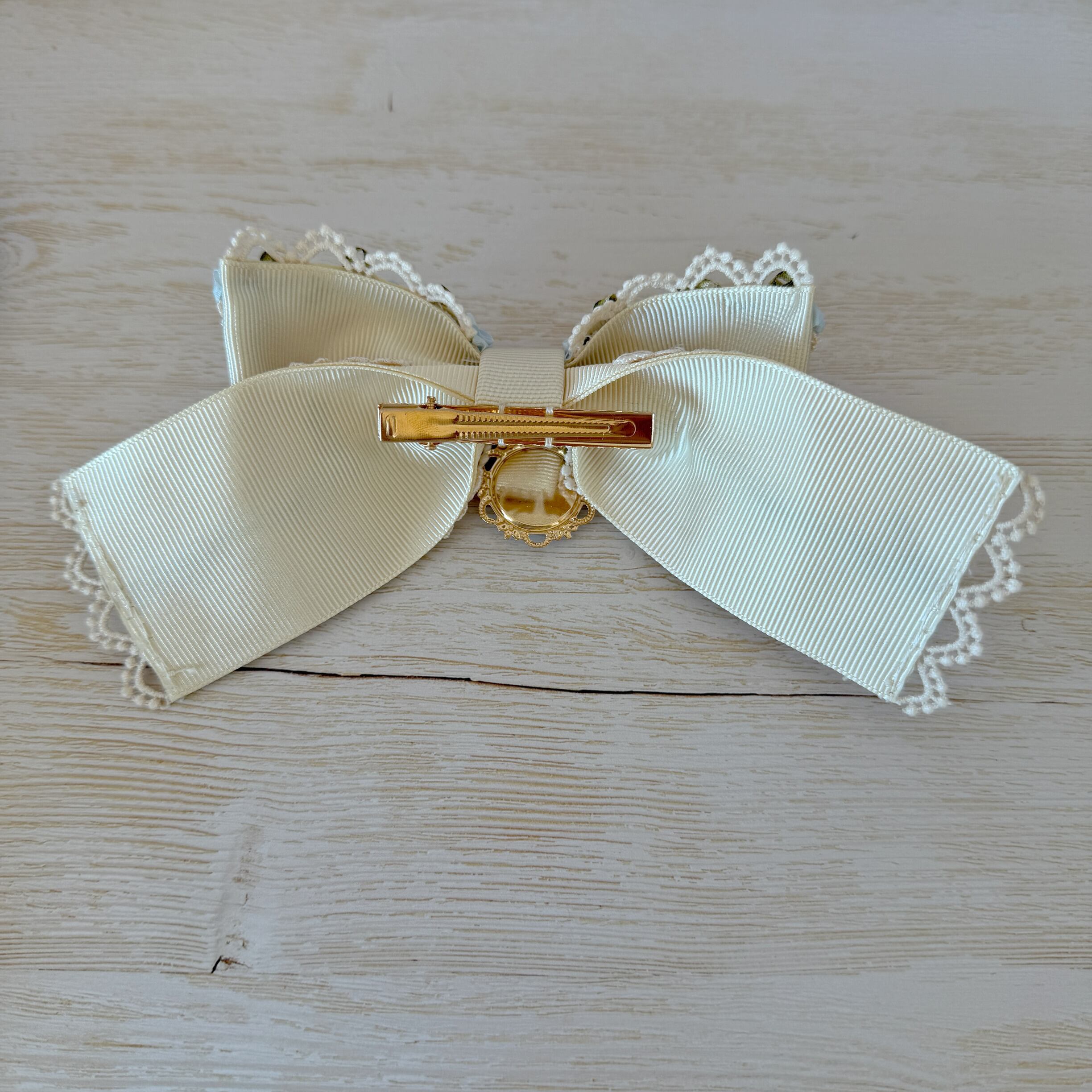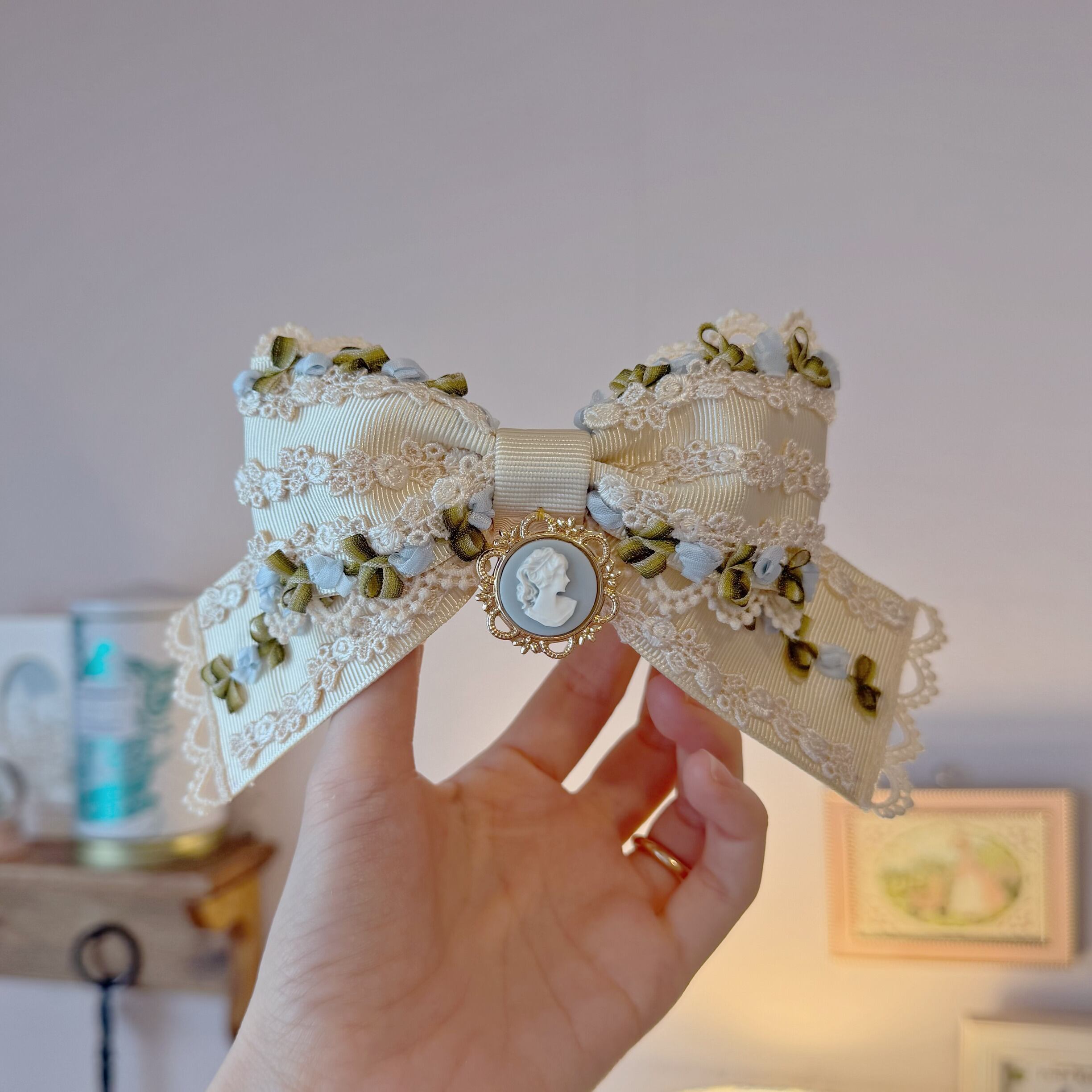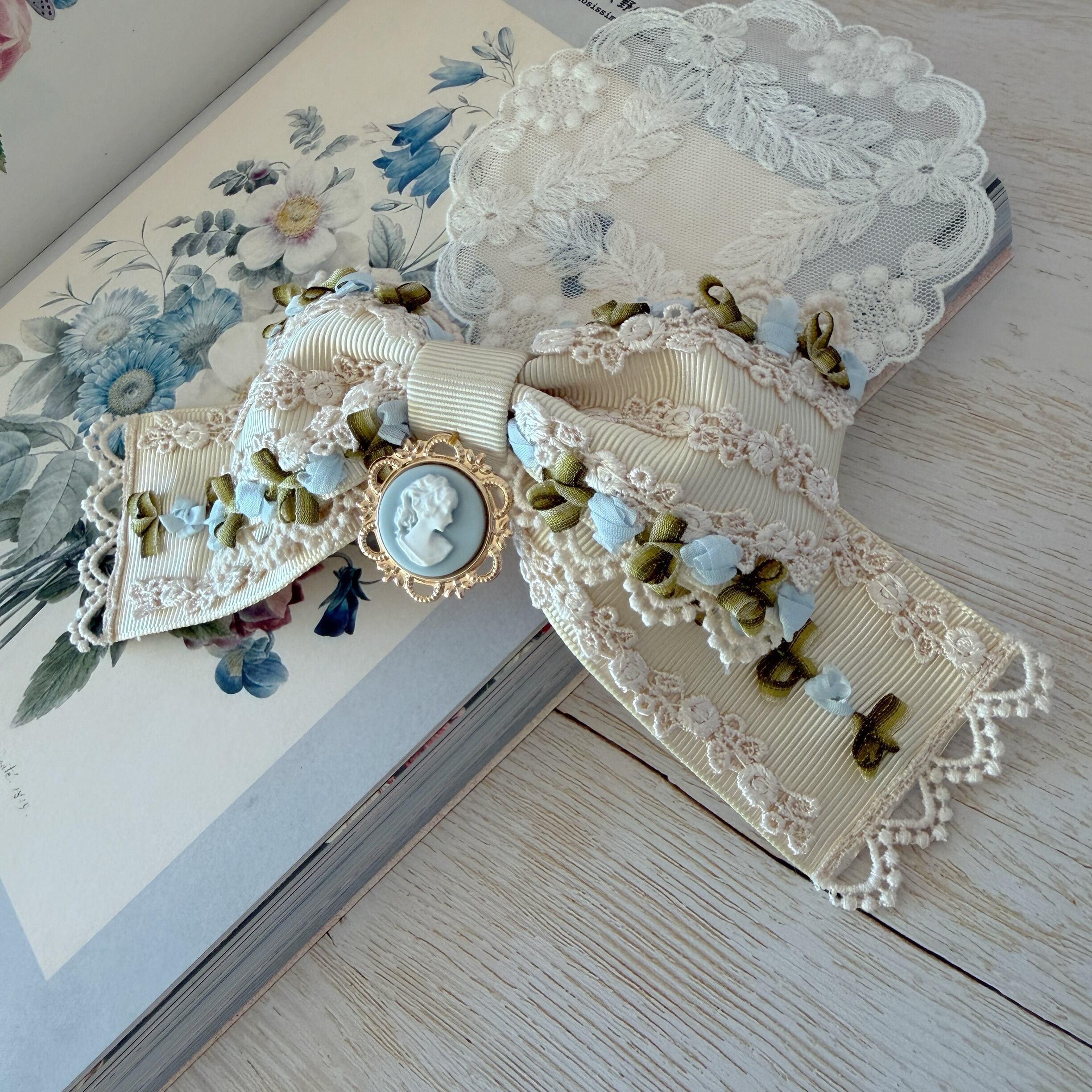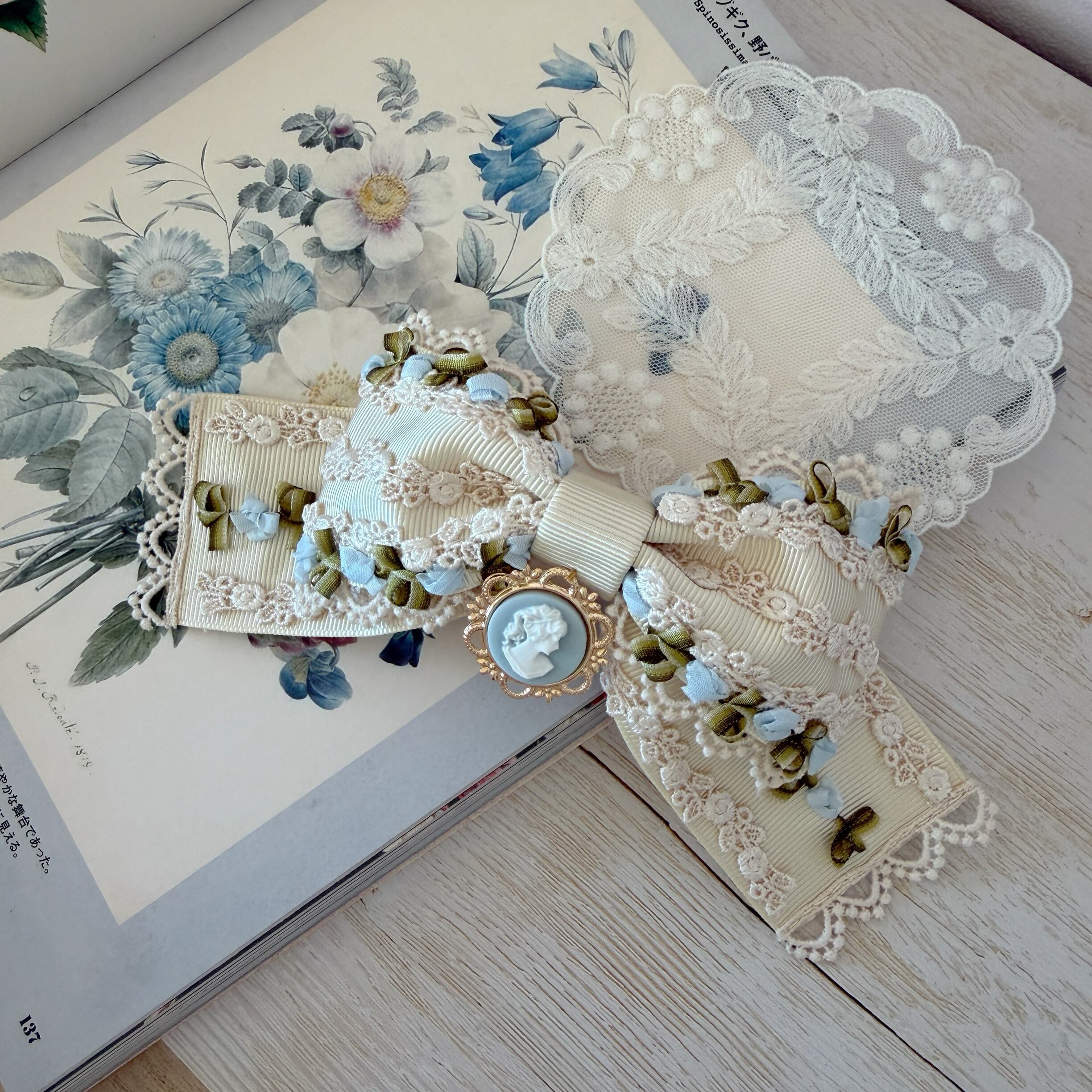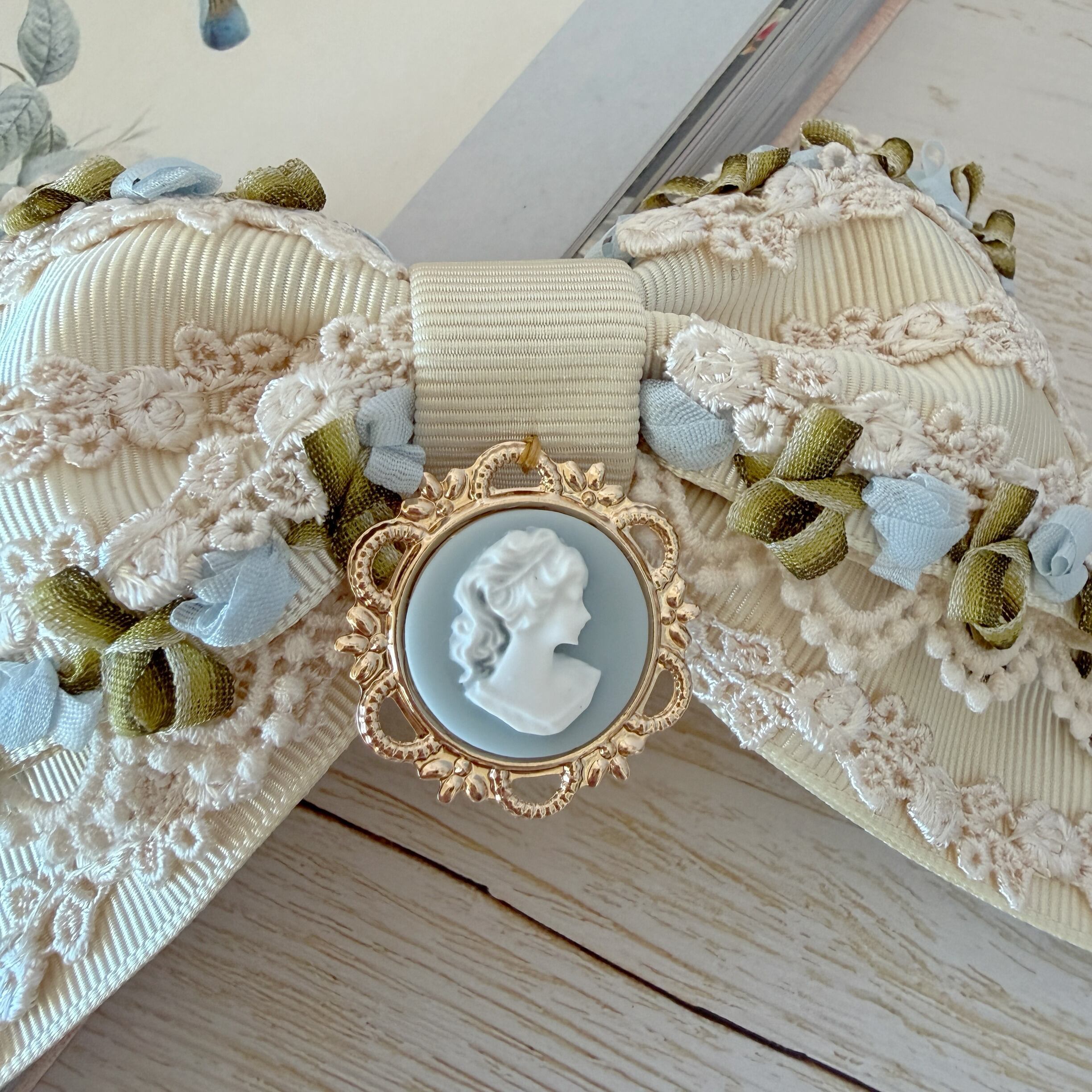 全体にロココトリムと生成りのレースを贅沢にあしらい、中央には象徴的なヴィンテージパーツのカメオを配置しました。
