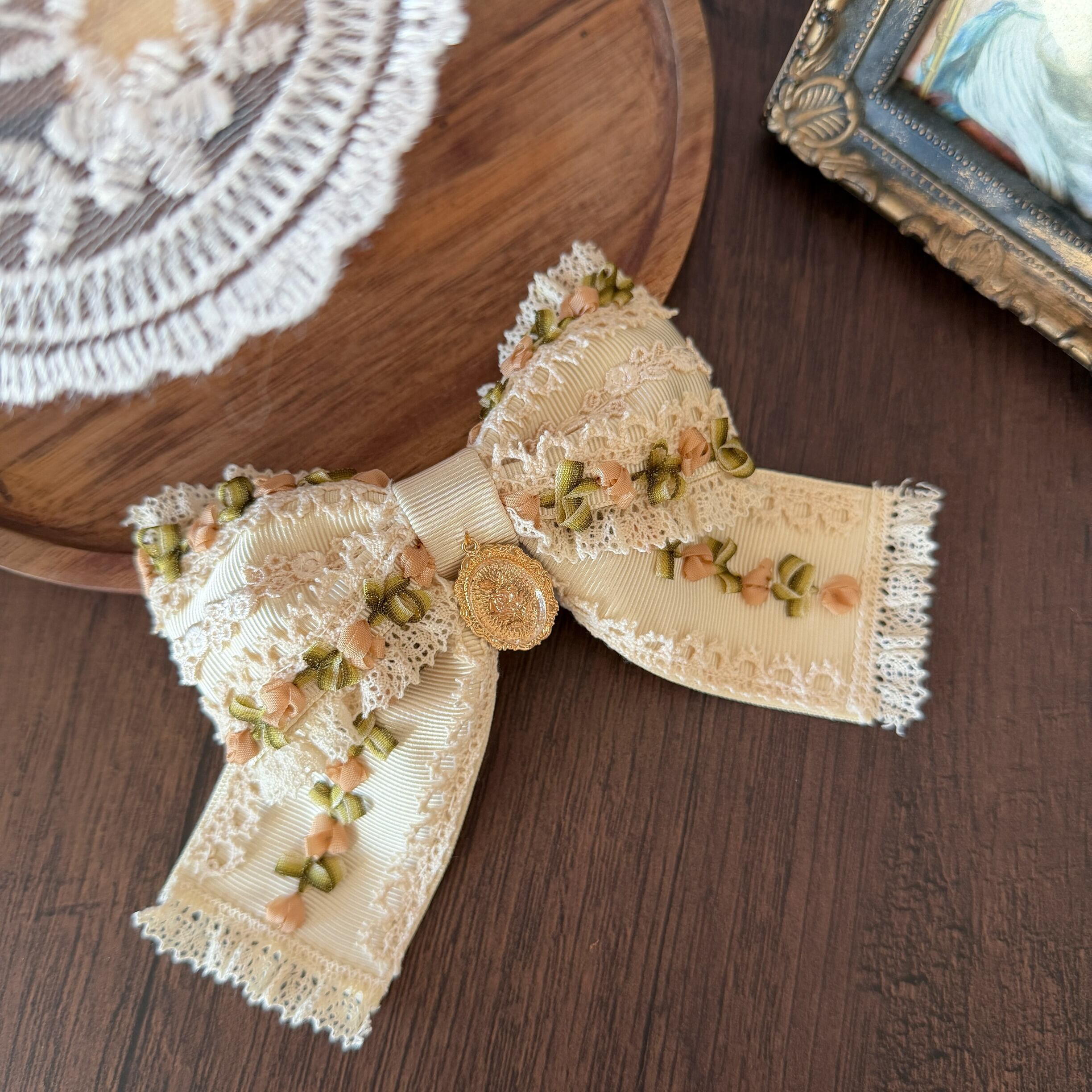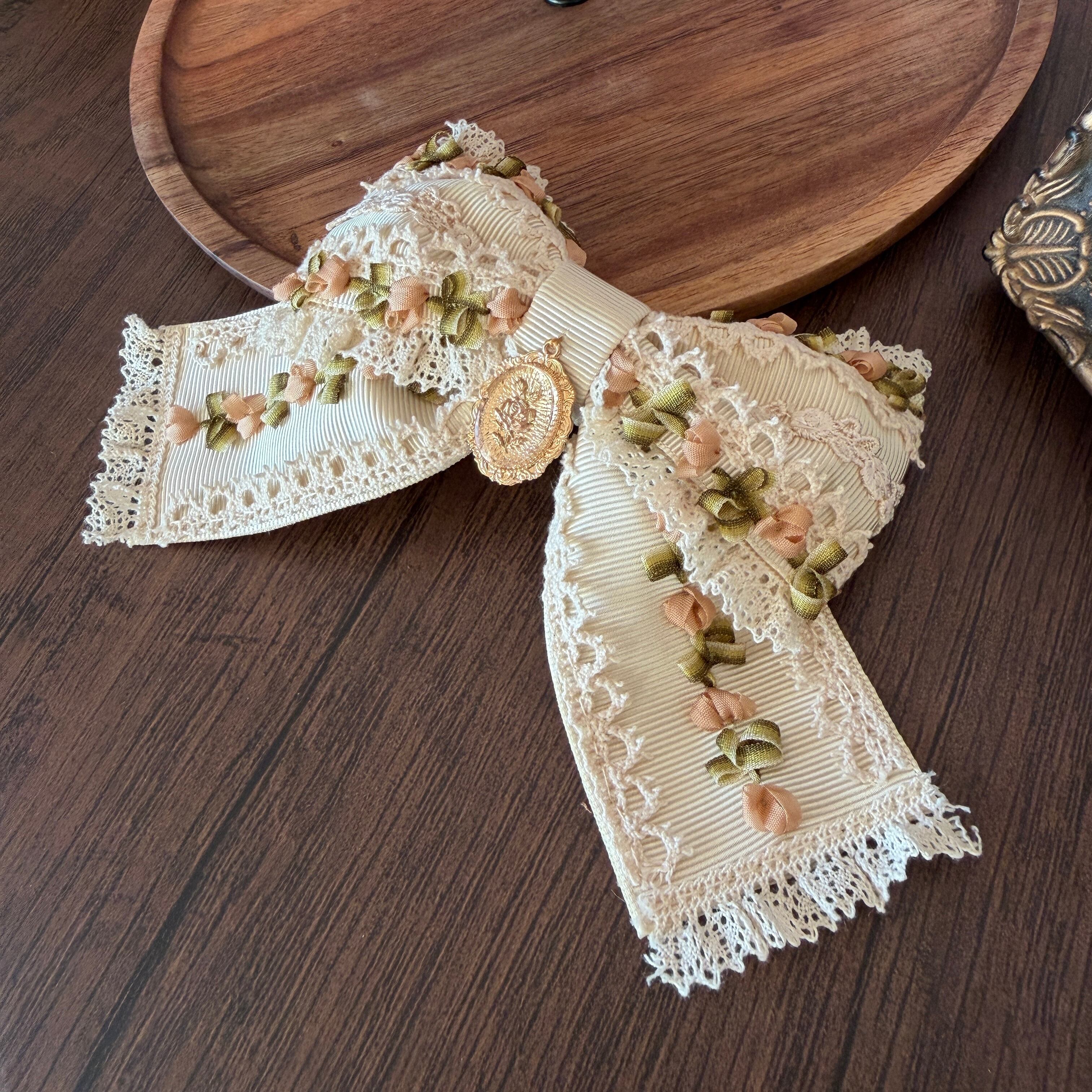 全体にロココトリムと生成りのレースを贅沢にあしらい、中央には象徴的なヴィンテージパーツのカメオを配置しました。