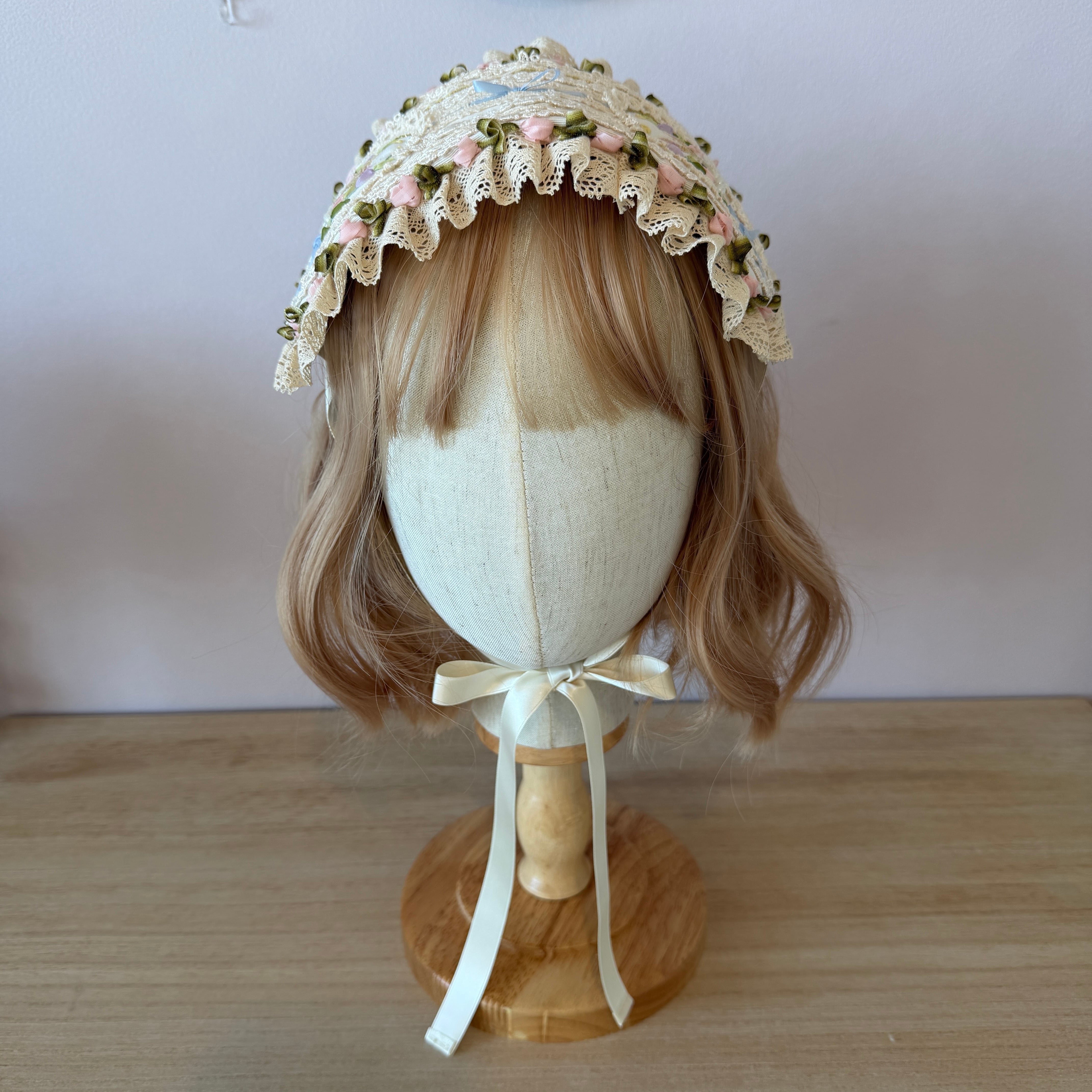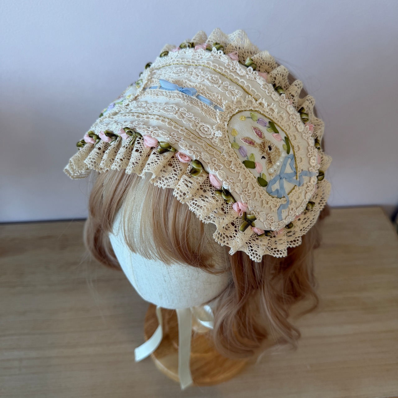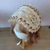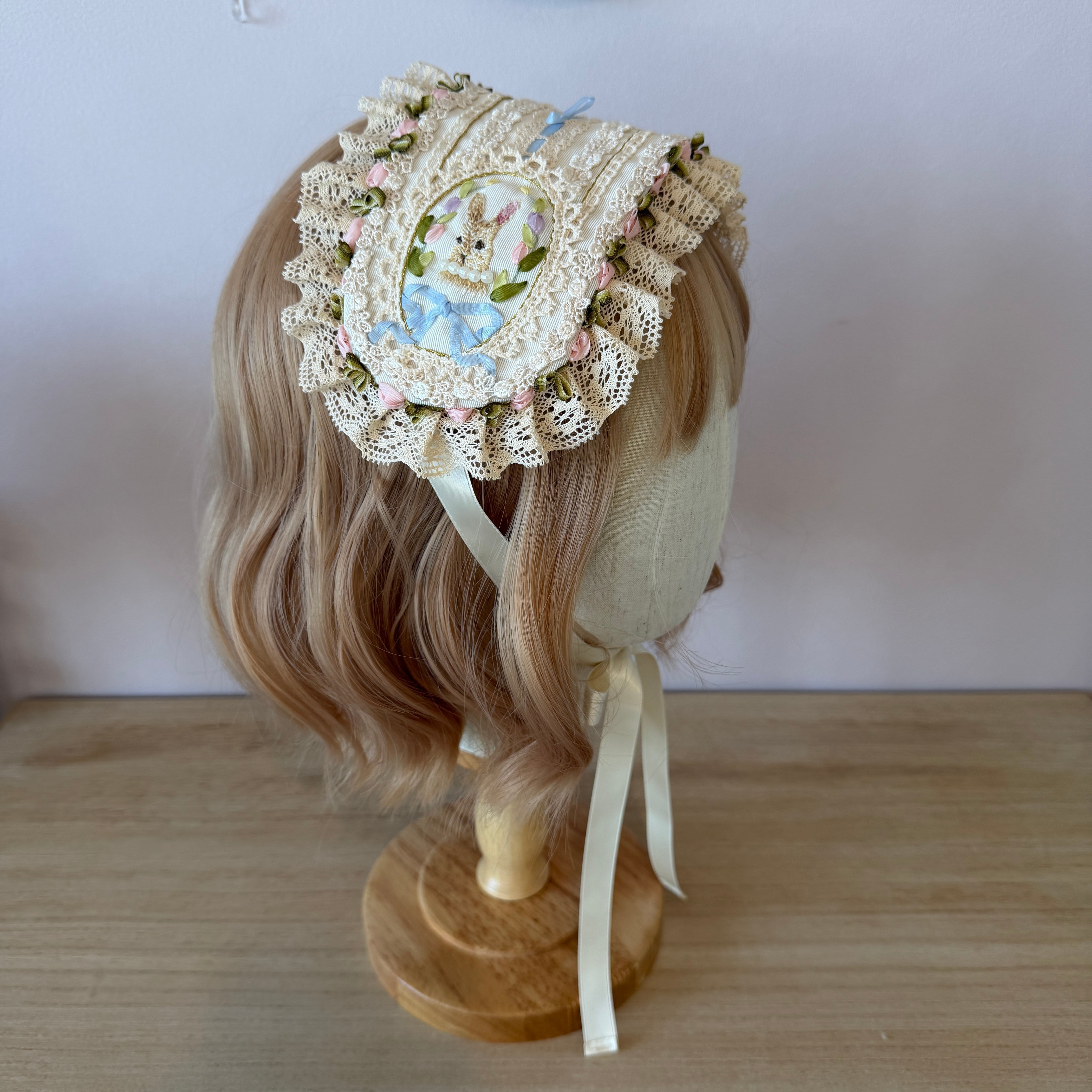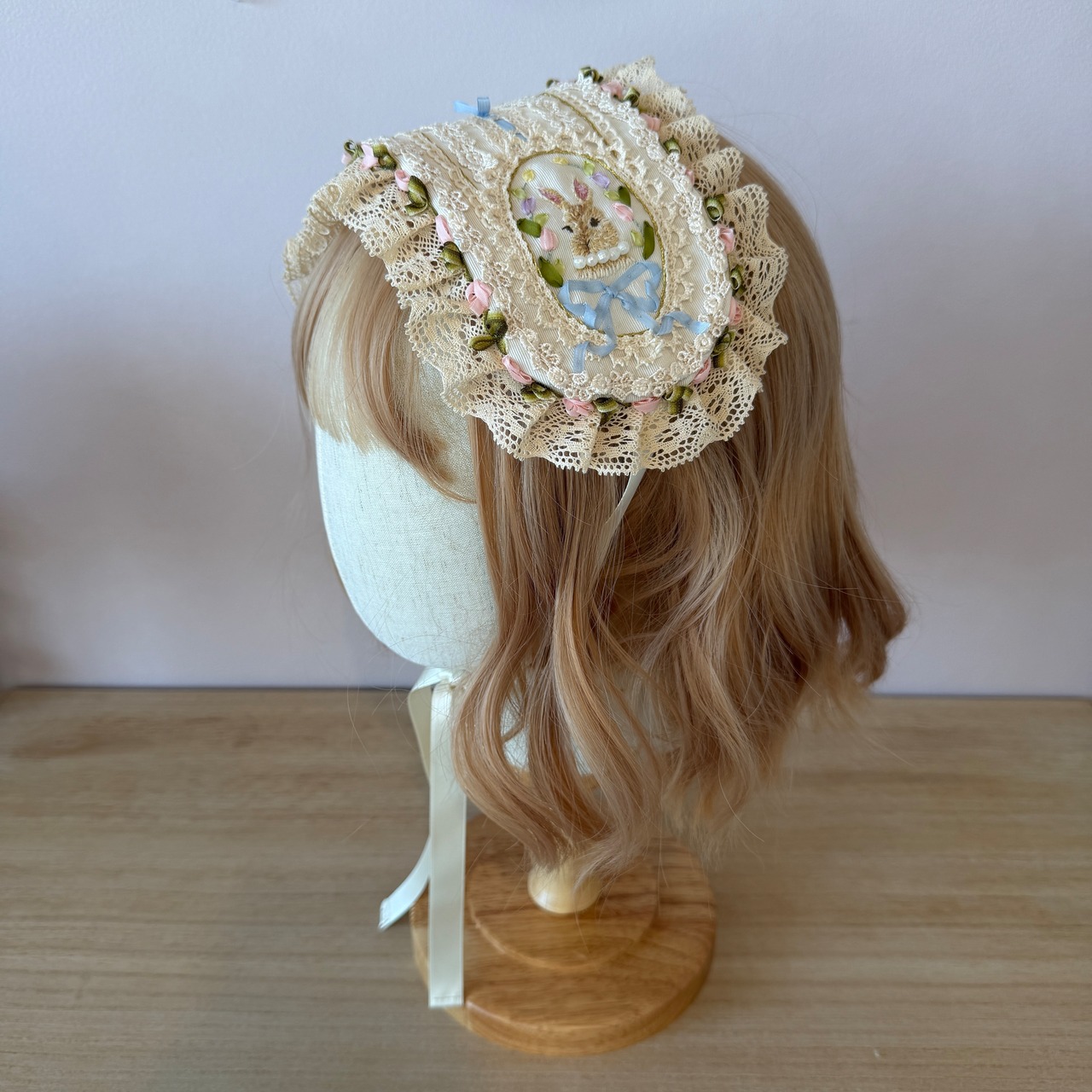 絵本の一場面を切り取ったような、愛らしいウサギの刺繍が主役のヘッドドレスです。