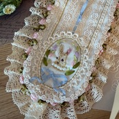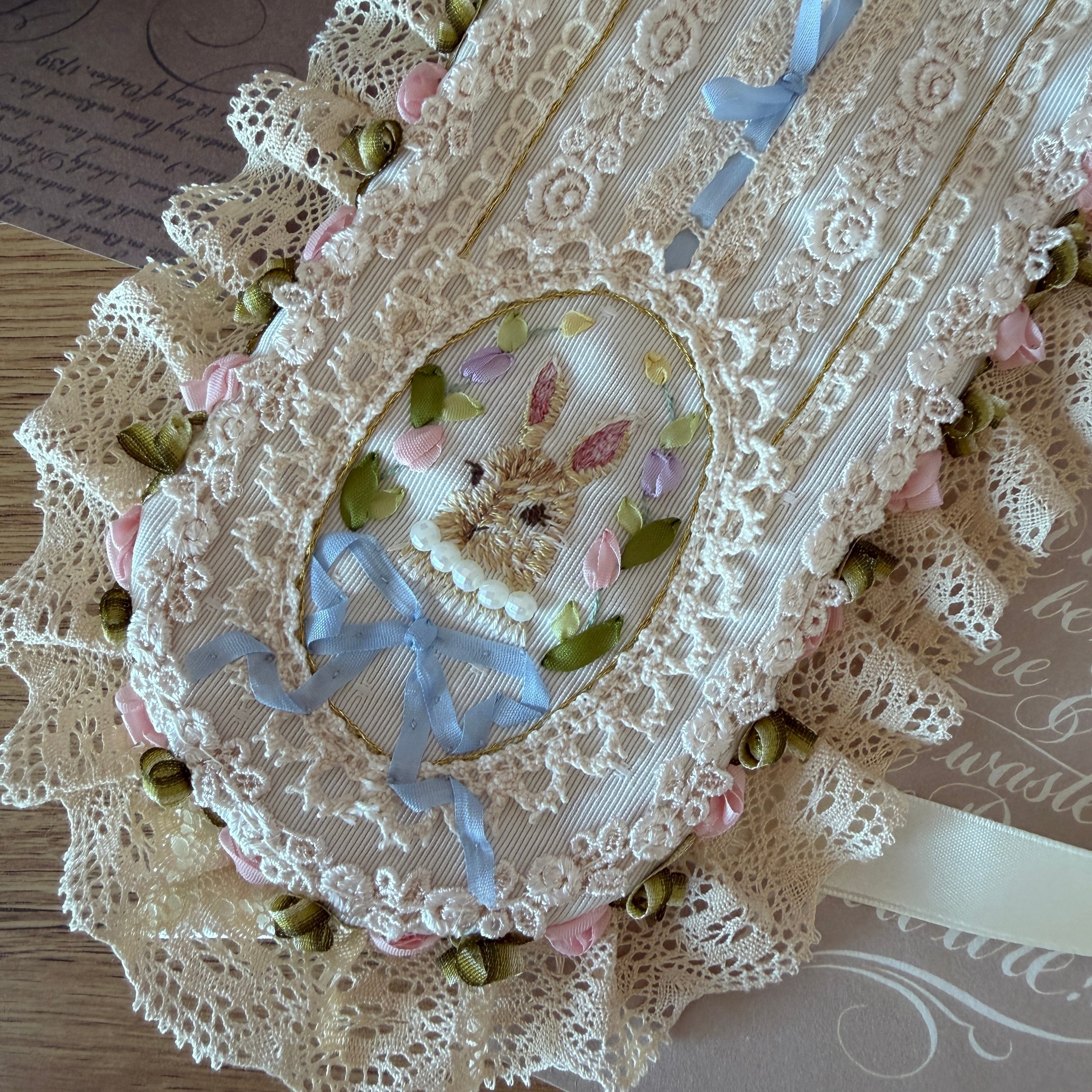 繊細なブルーのリボンと、柔らかな草花の刺繍に囲まれたウサギが、まるでお花畑で遊んでいるような温もりを感じさせます。