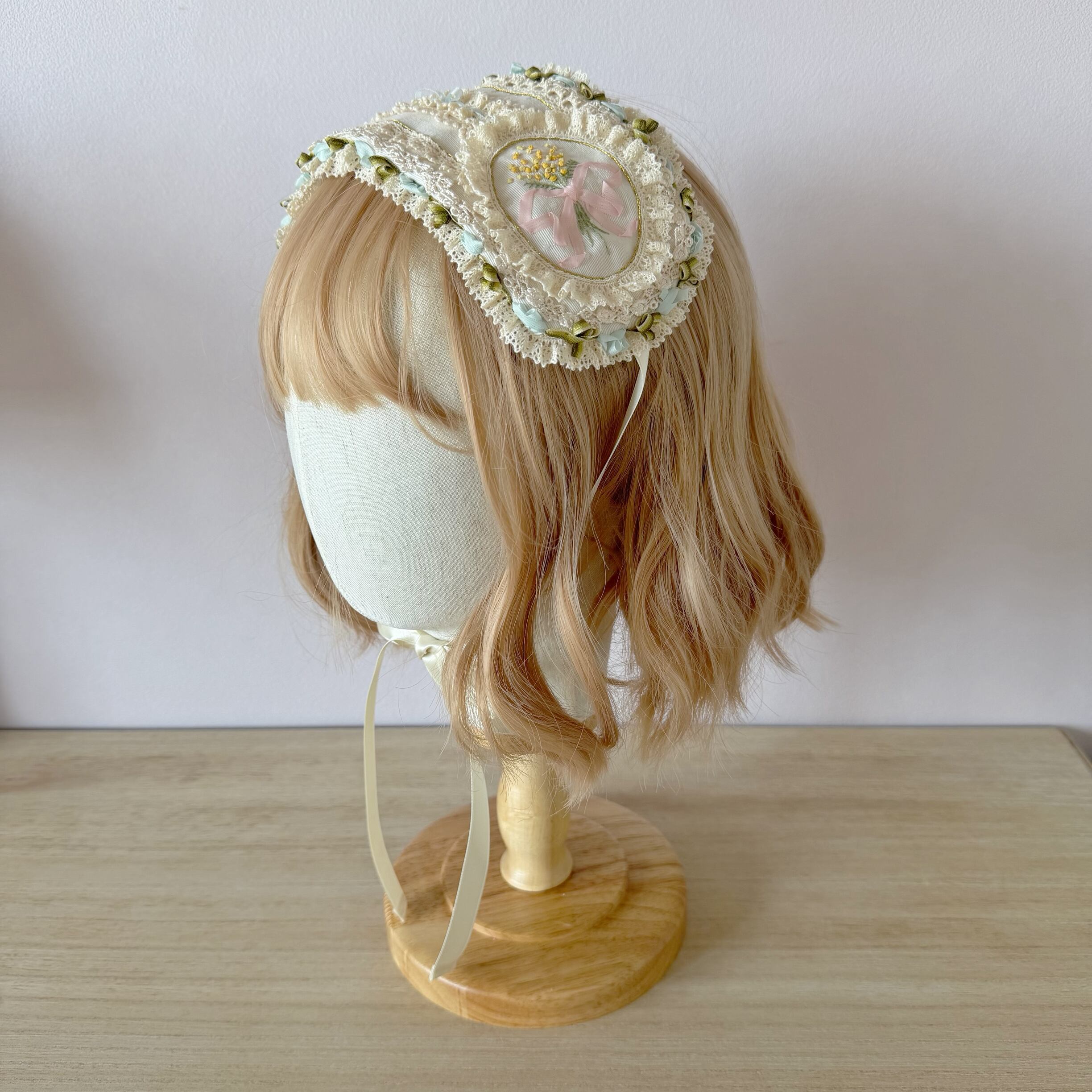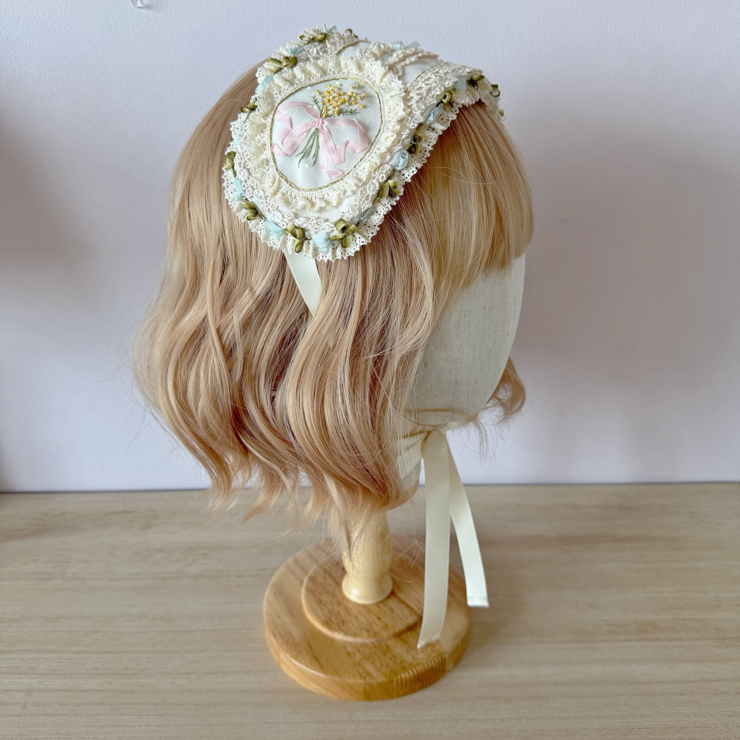 春の柔らかな日差しを浴びて咲き誇る、愛らしいミモザを刺繍で描いたヘッドドレスです。