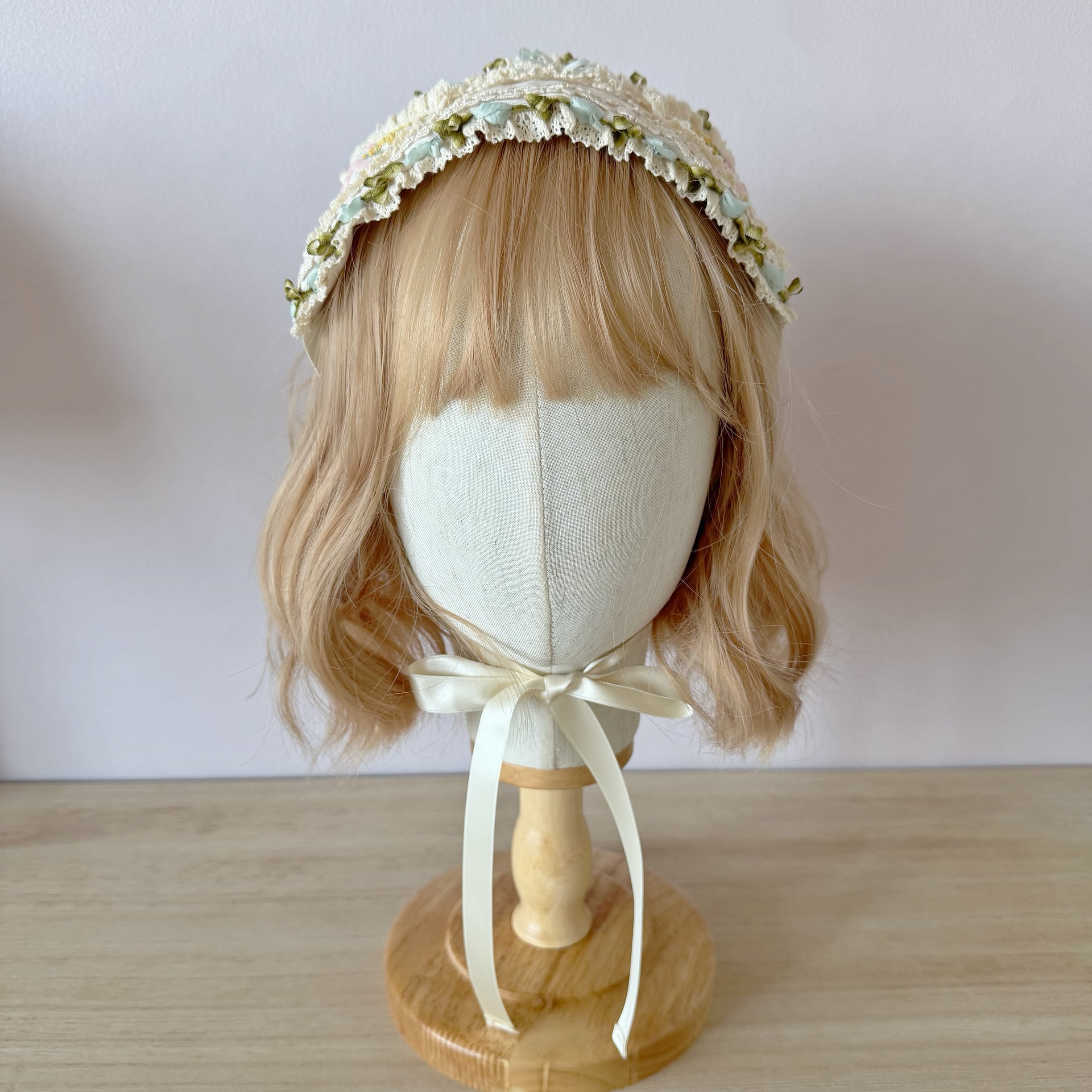 アクセントに添えたダスティーブルーとオリーブグリーンの小リボンが、甘すぎないクラシカルな上品さを引き立てます。