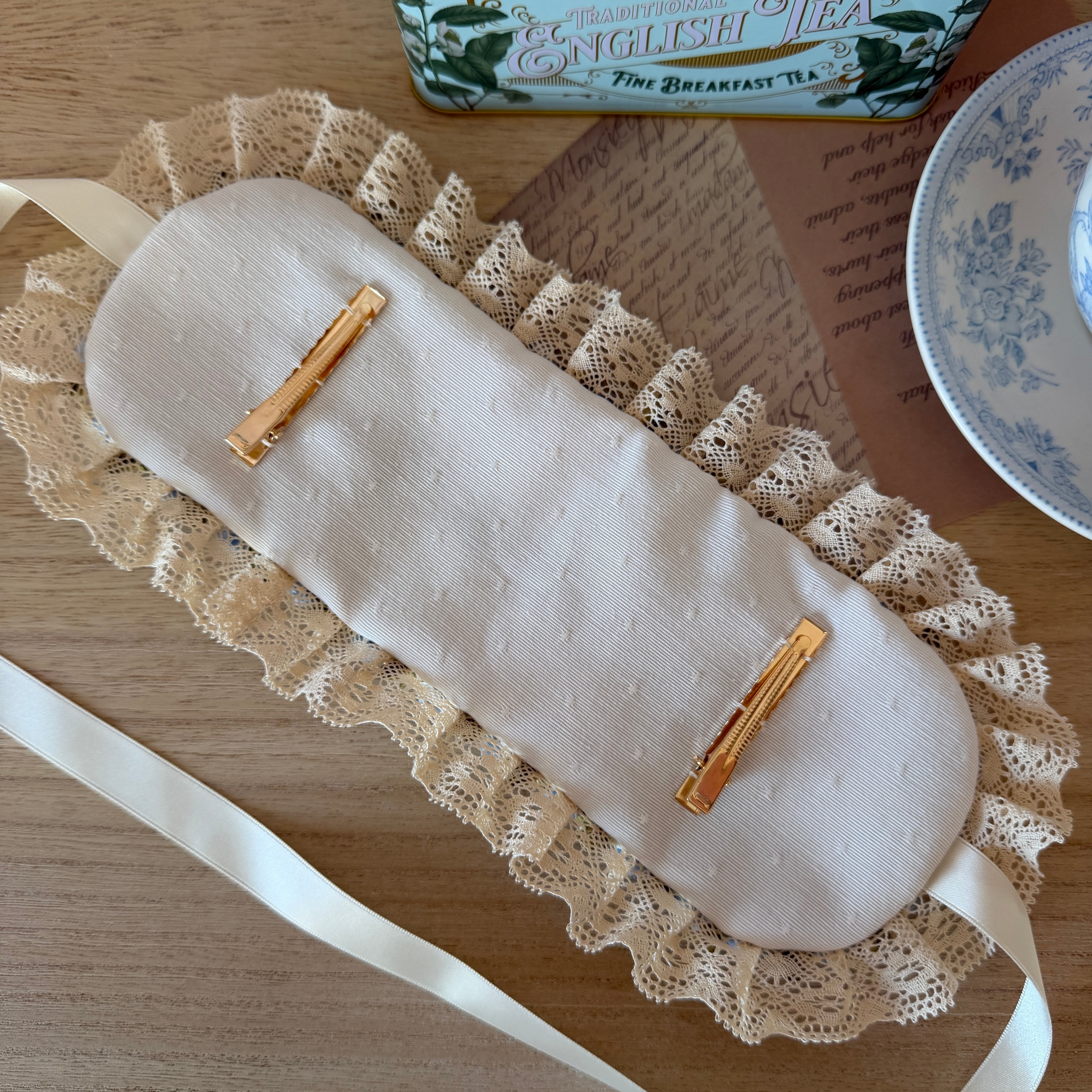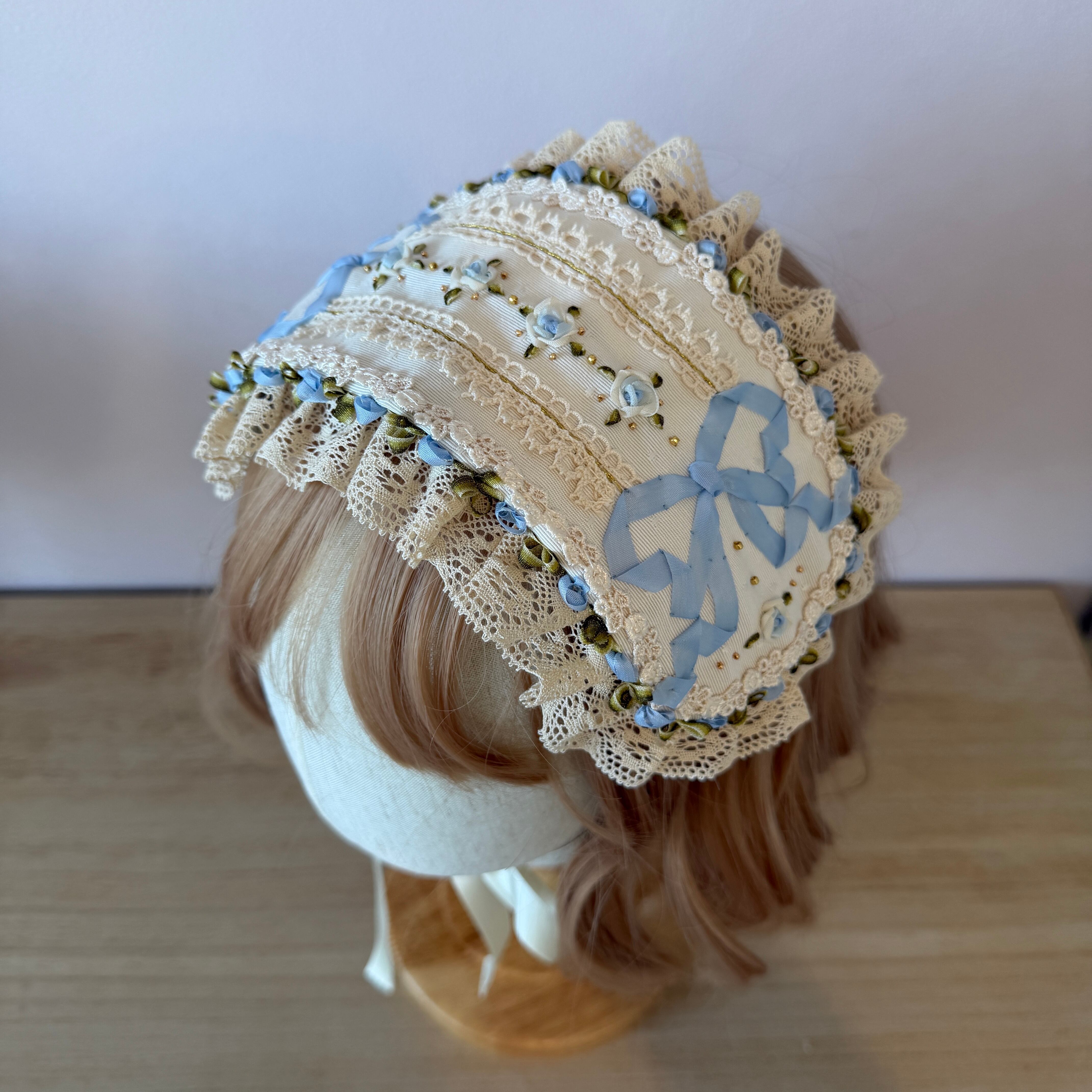 繊細なレースの間を縫うように施された、可憐な白い小花の刺繍と爽やかなブルーのリボンが、お顔周りに透明感のある華やぎを添えてくれます。