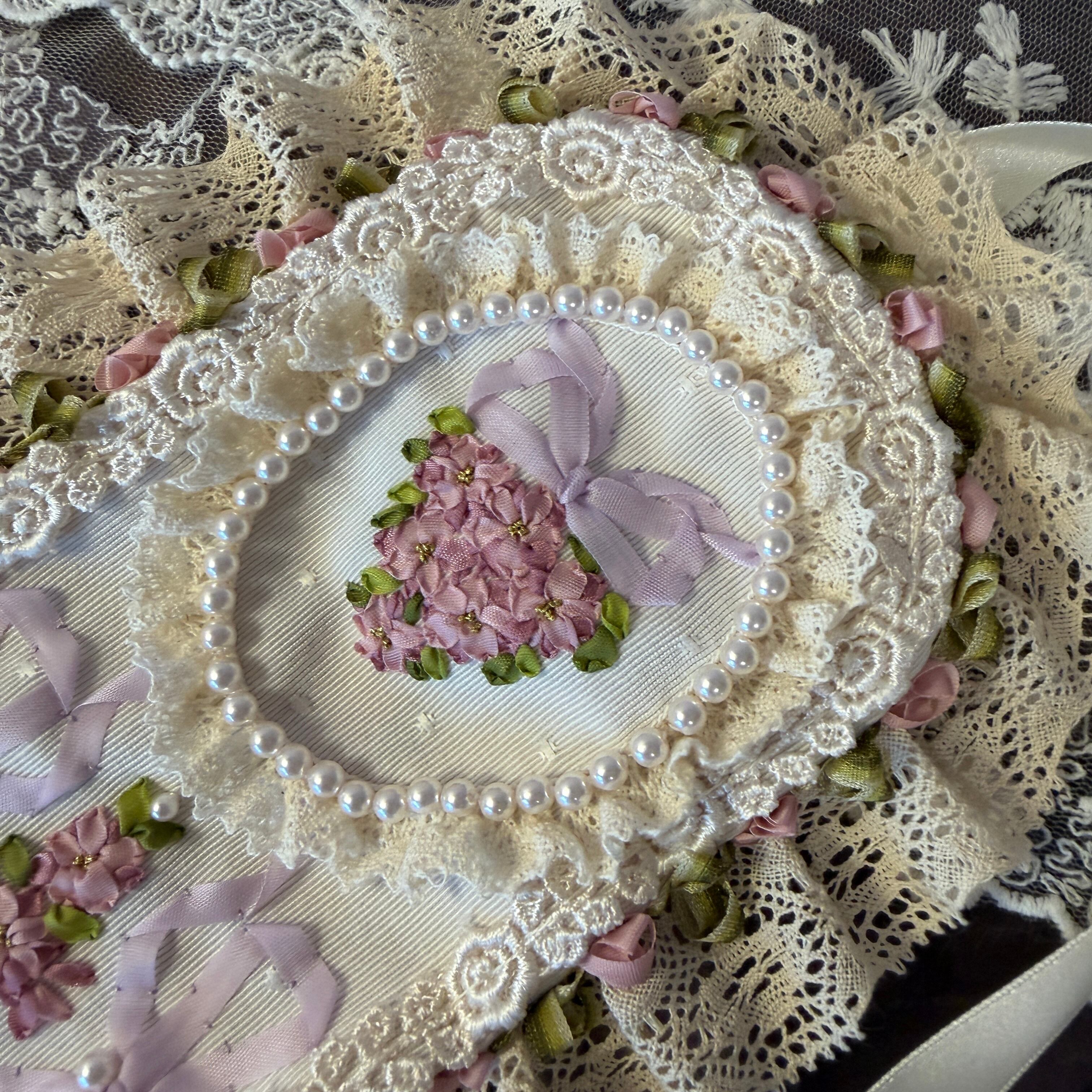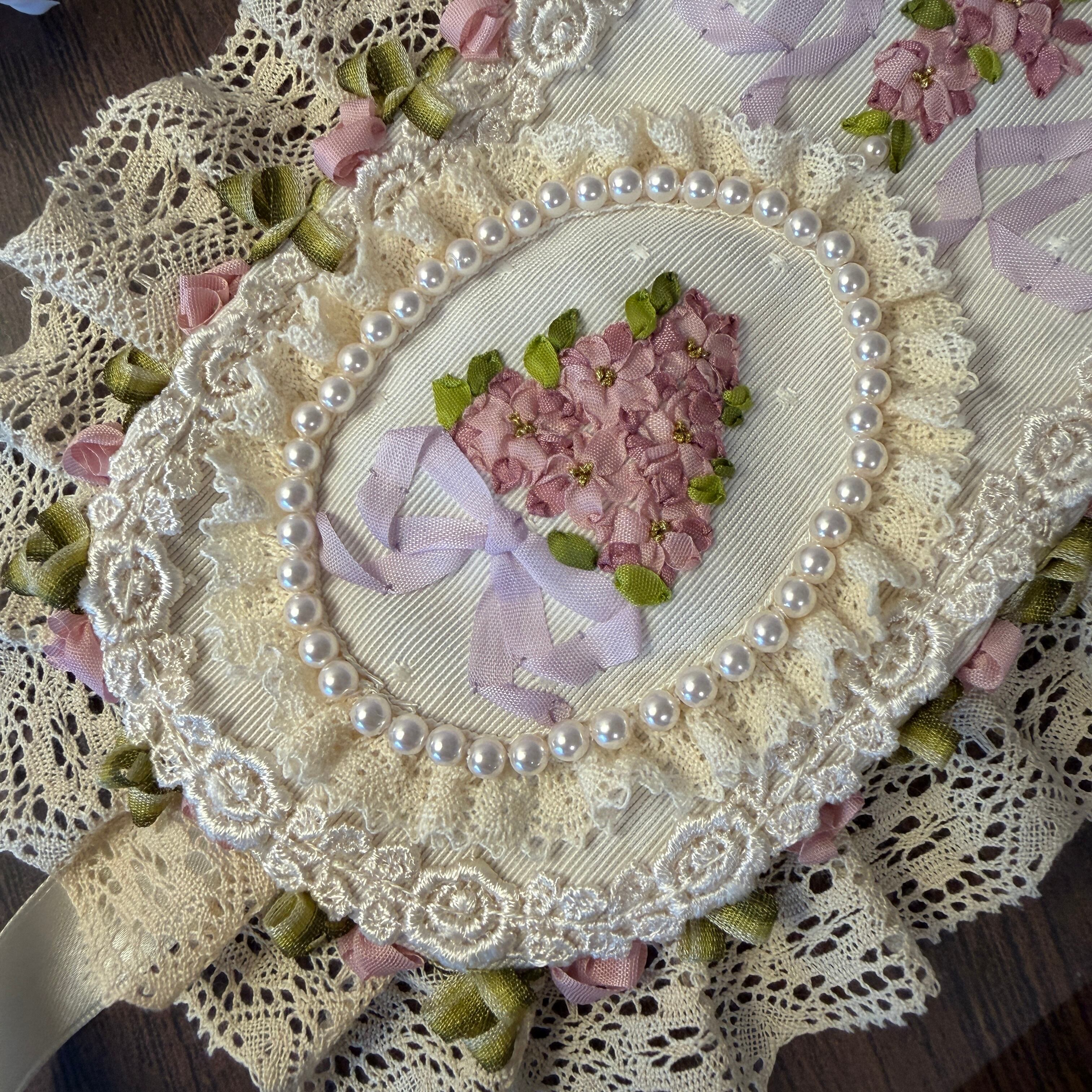 中央のオーバル枠の中に、濃淡のピンクを使い分けた密度の高いリボン刺繍を施し、存在感を際立たせています。