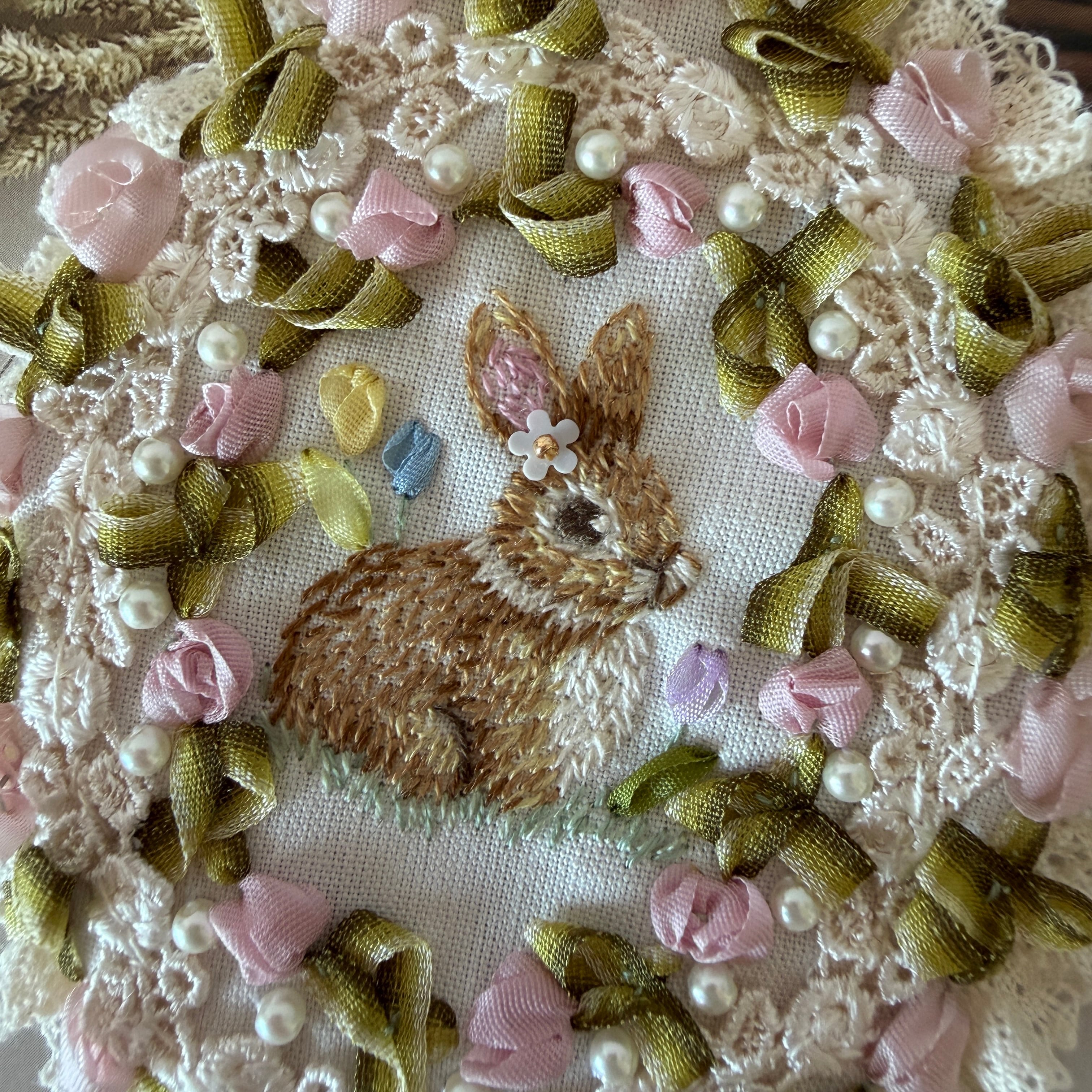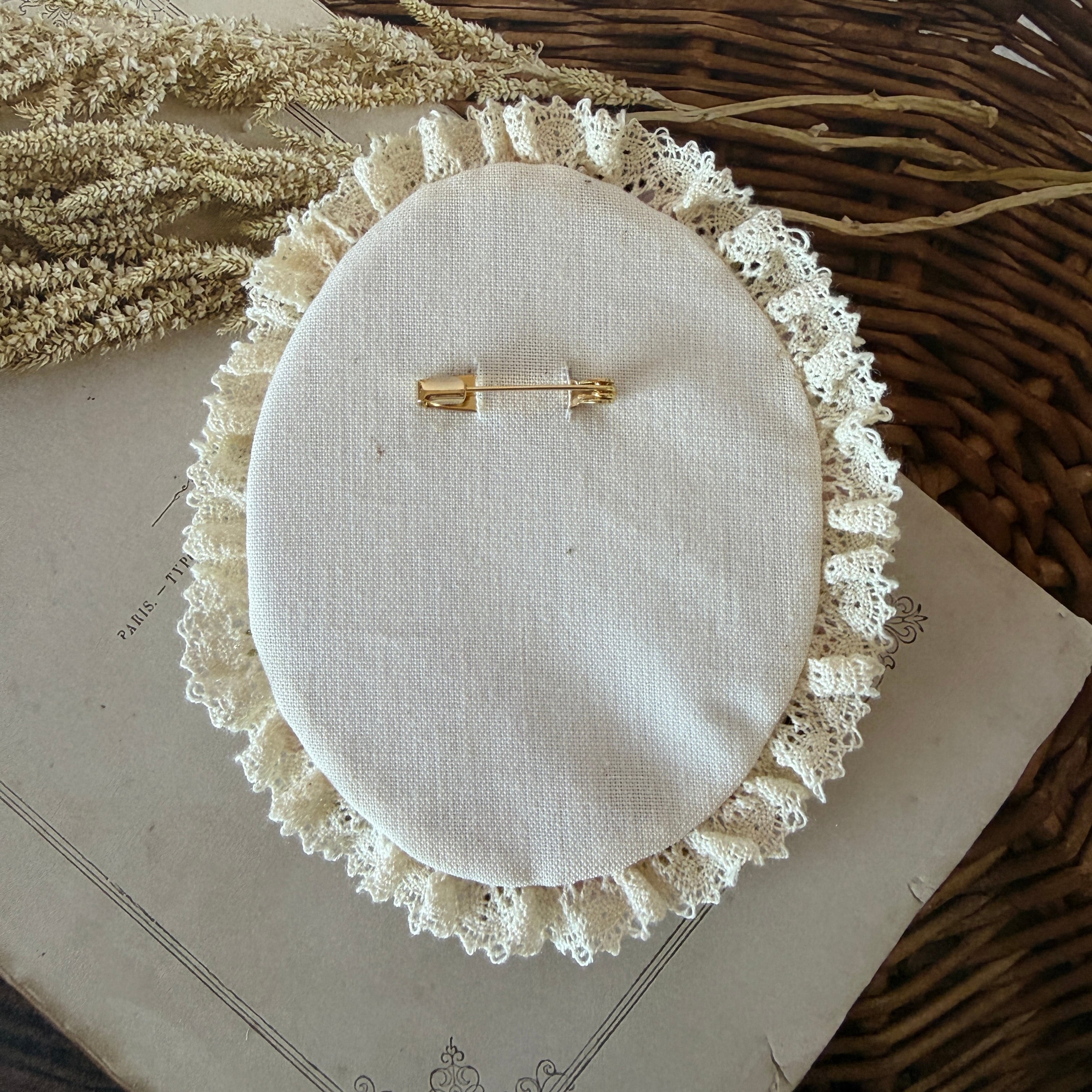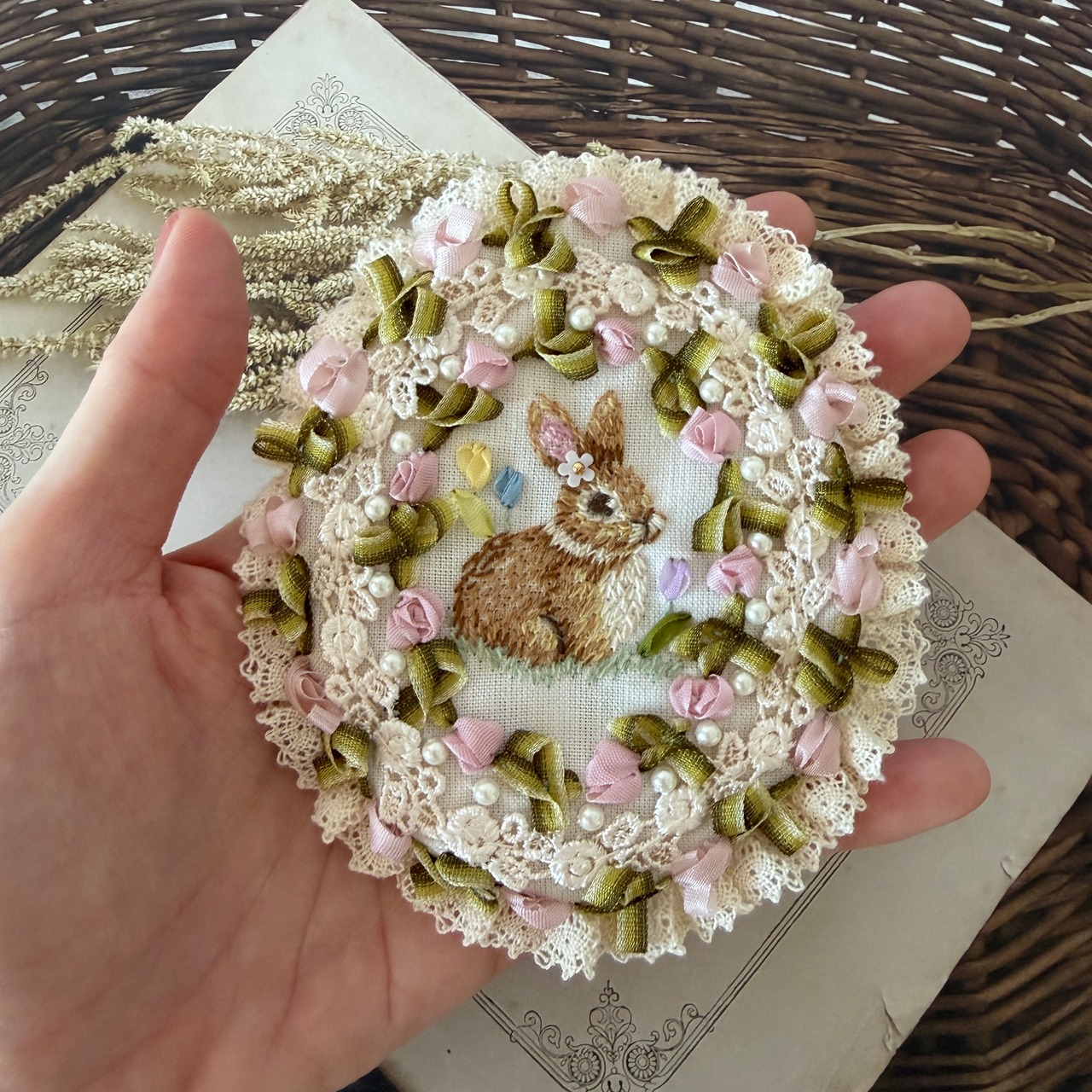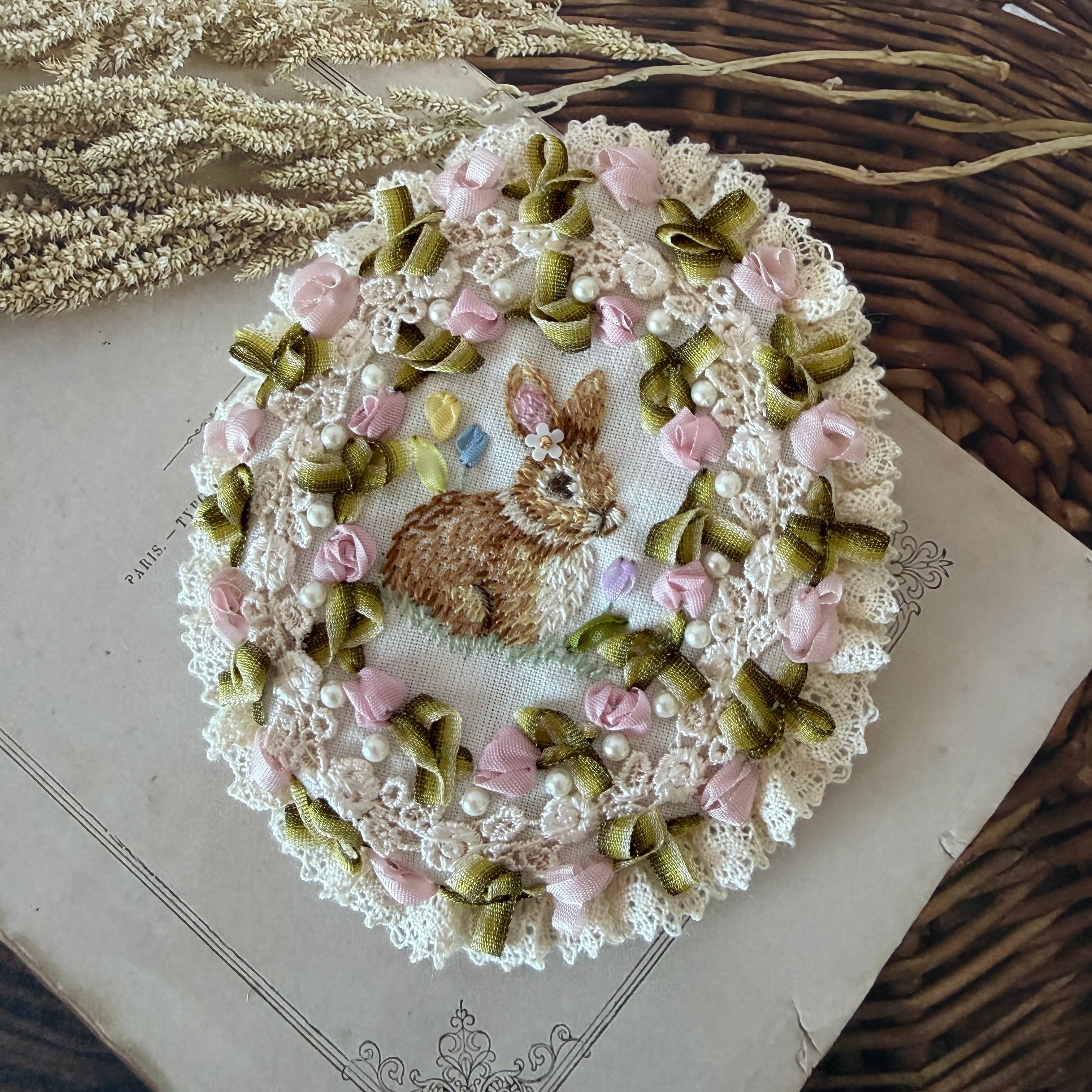 糸刺繍ならではの温もりと、リボンで作るヴィクトリアンな装飾美を掛け合わせ、胸元に小さな「癒やしの情景」を届けます。