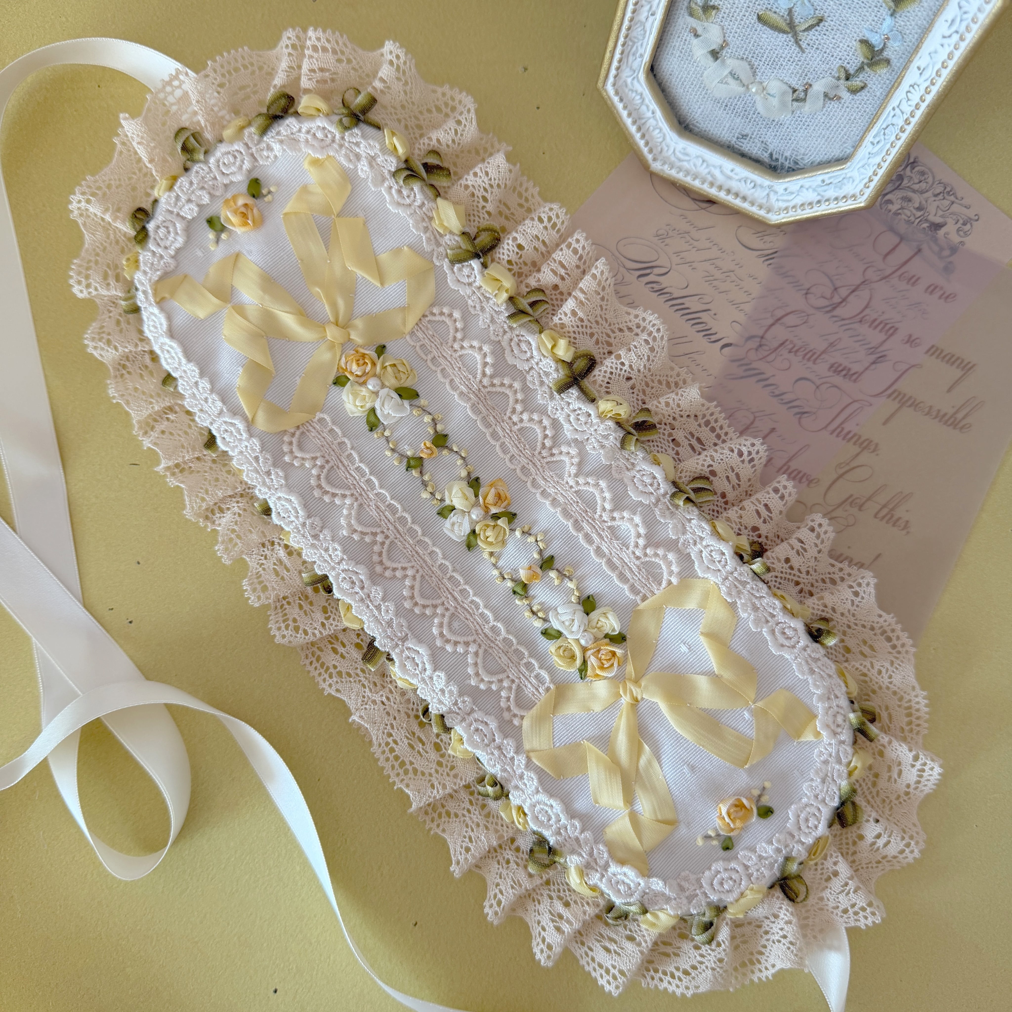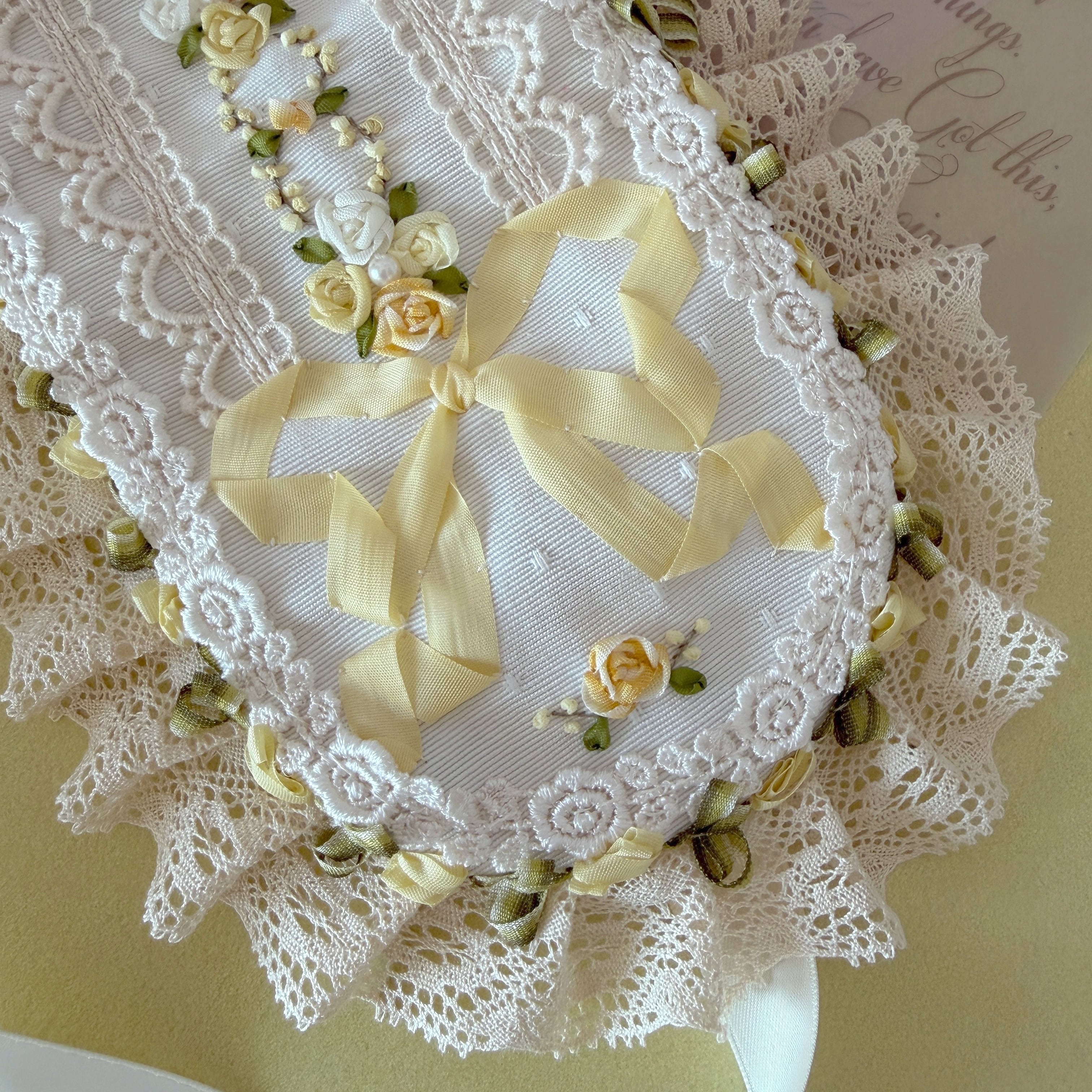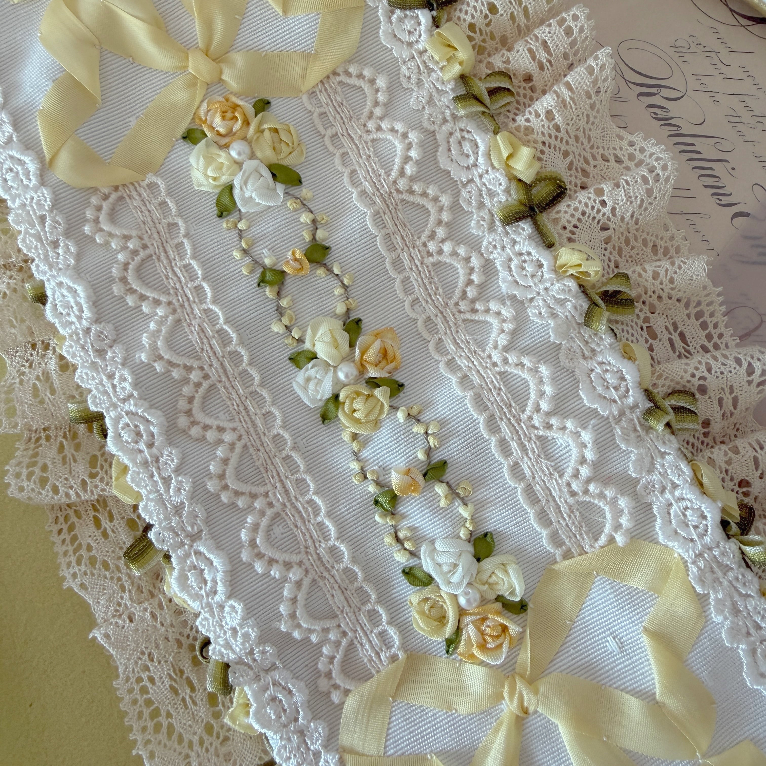 幾重にも重なるアイボリーのレースは、まるで幾千もの花びらのよう。その中央には、ふんわりとしたリボン刺繍で、一輪の黄薔薇と、寄り添うように愛らしいミモザをあしらいました。