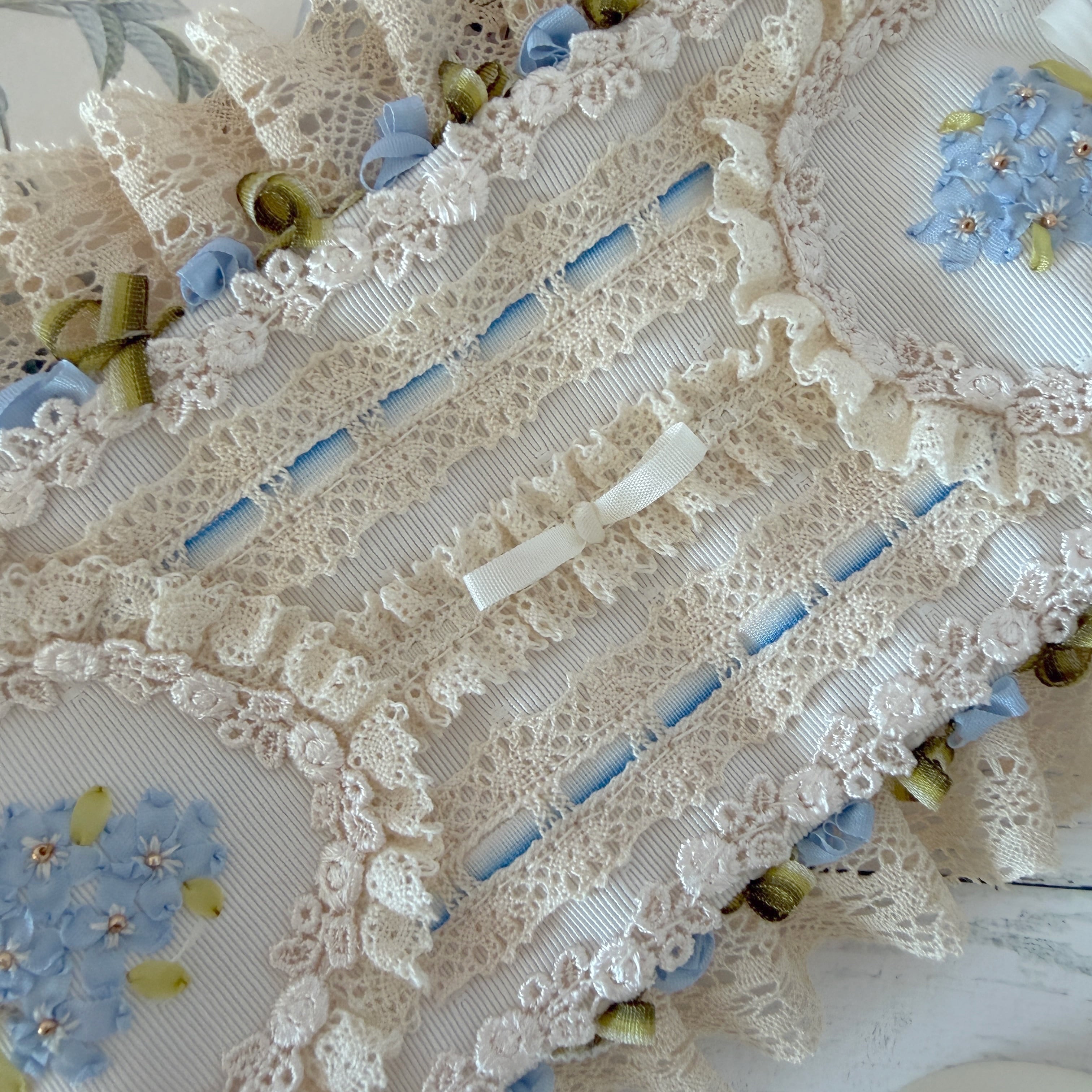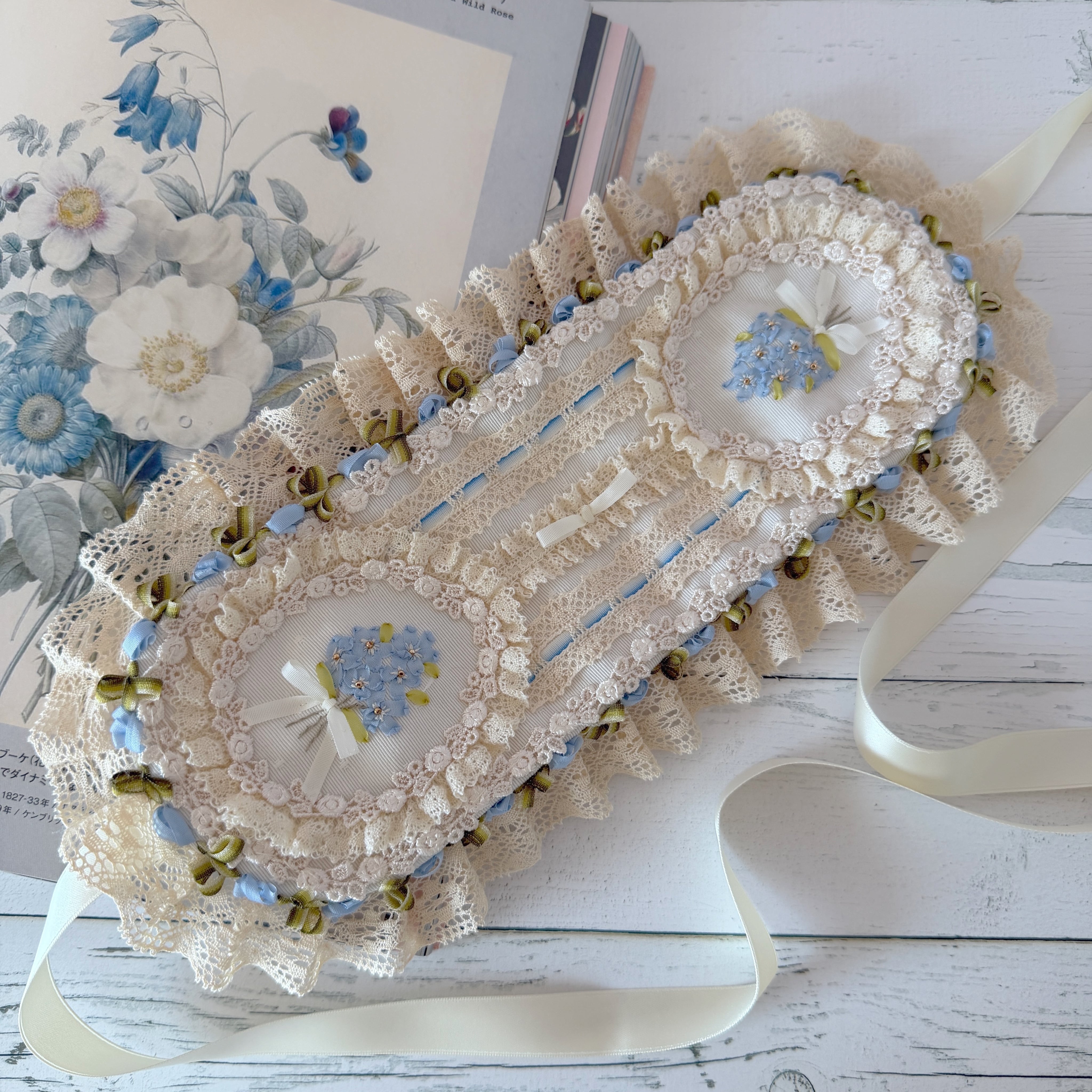 「どこまでも澄んだ心」という花言葉を持つネモフィラを、一針一針、淡いブルーのリボンで綴じ込めました。中央で結ばれた小さなリボンは、大切な誰かへ、あるいは自分自身へ贈る花束の証。