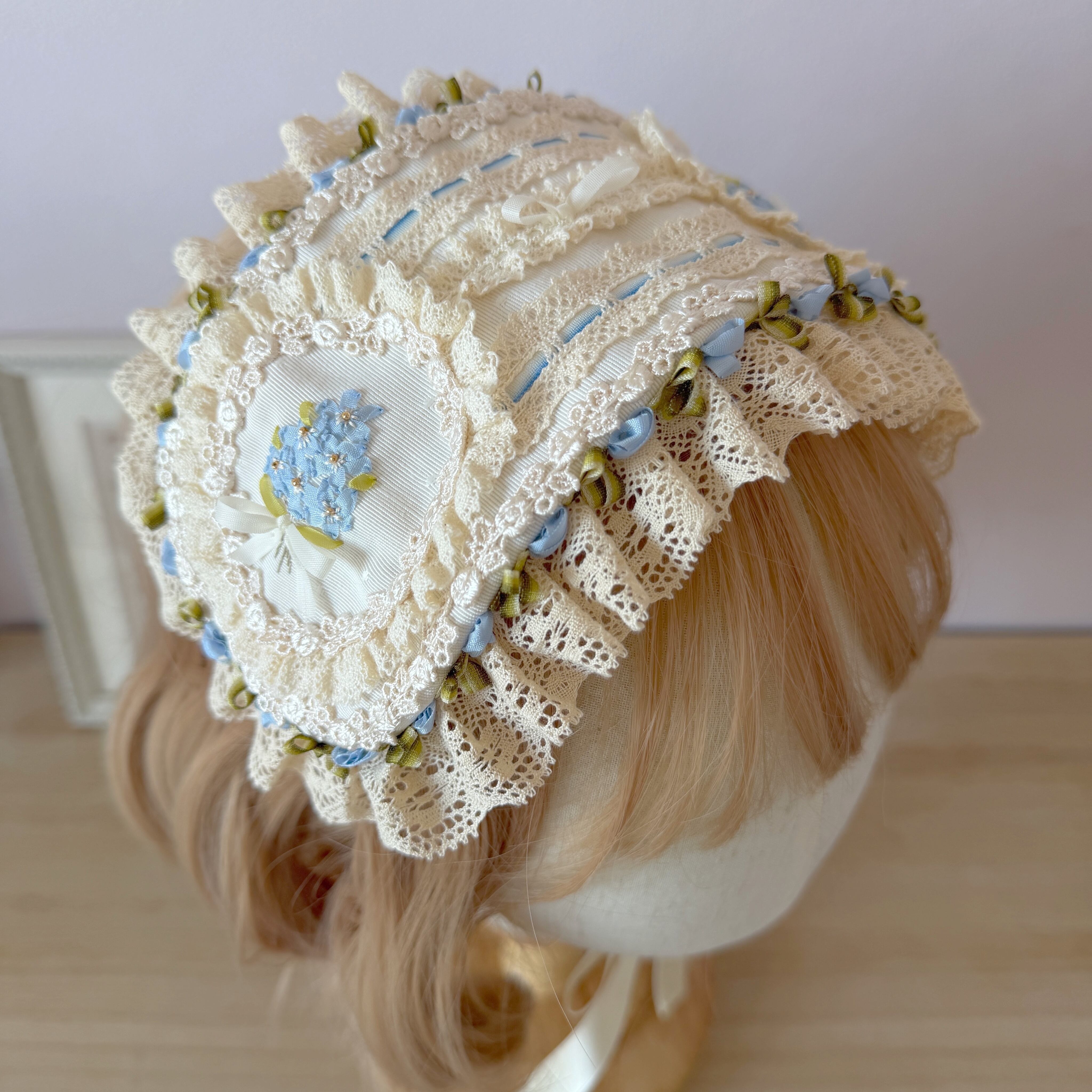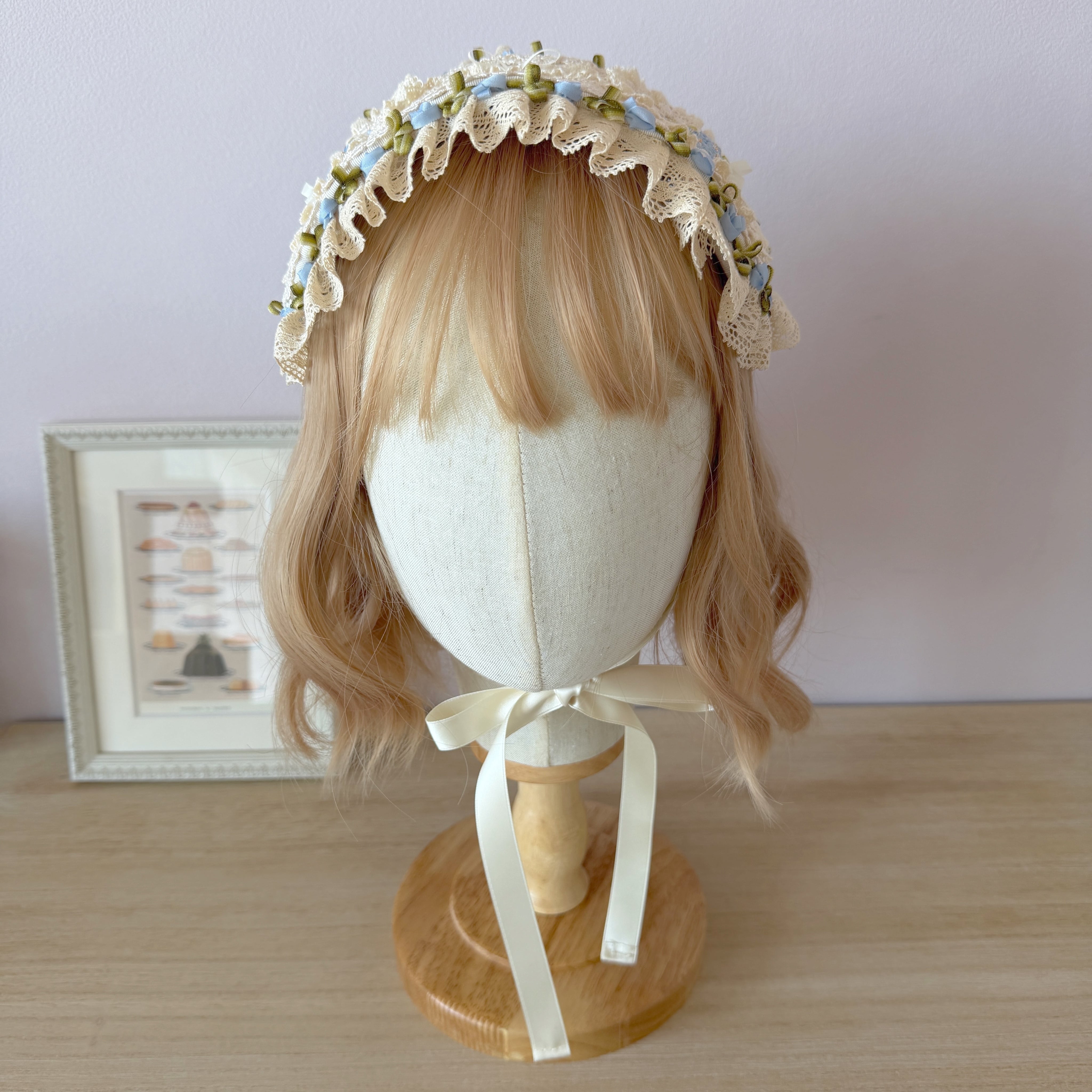 幾重にも重なるアイボリーのレースは、花束を包むラッピングのように優しくお顔周りを彩ります。身に着けるたび、春の丘に立っているような清々しさに包まれる一品です。