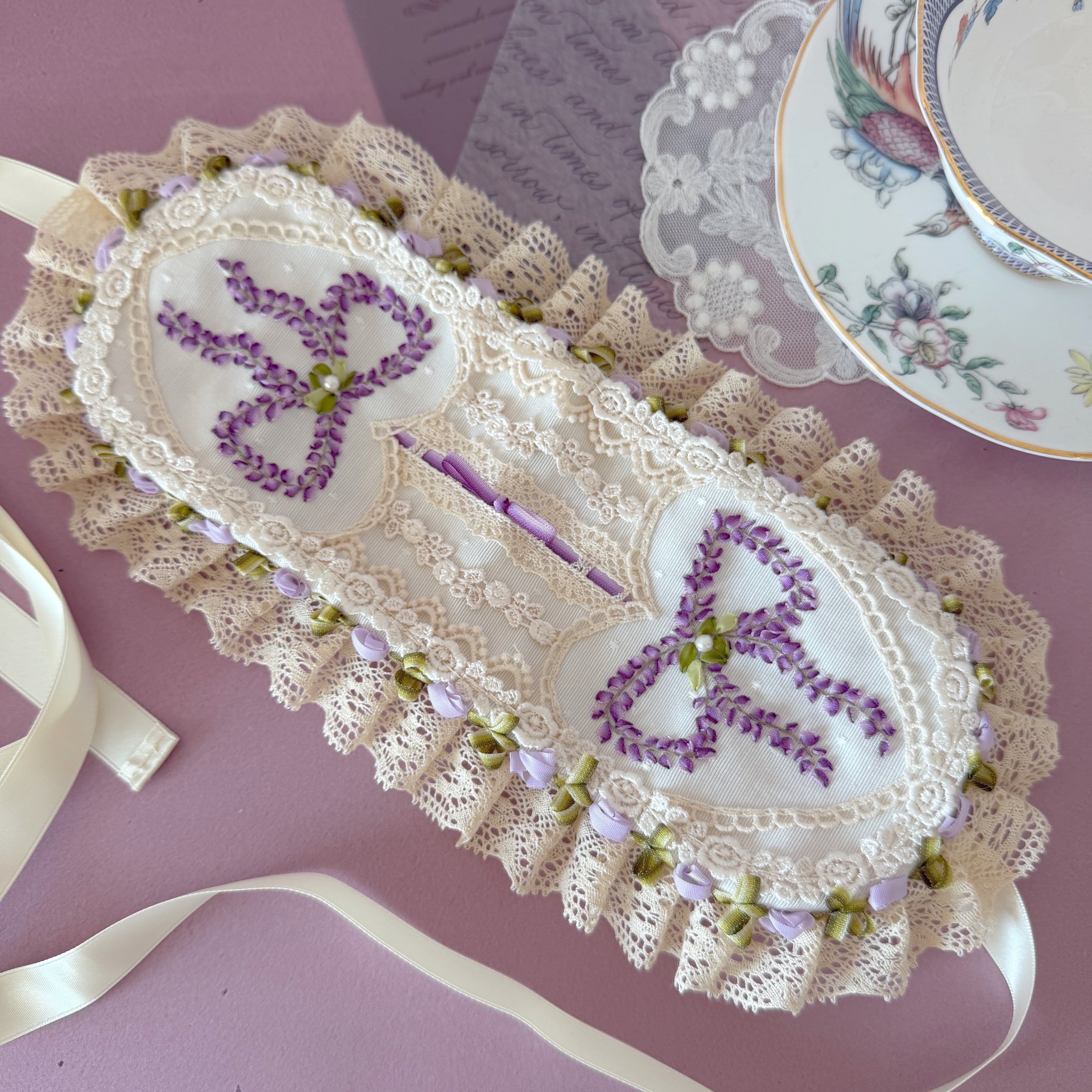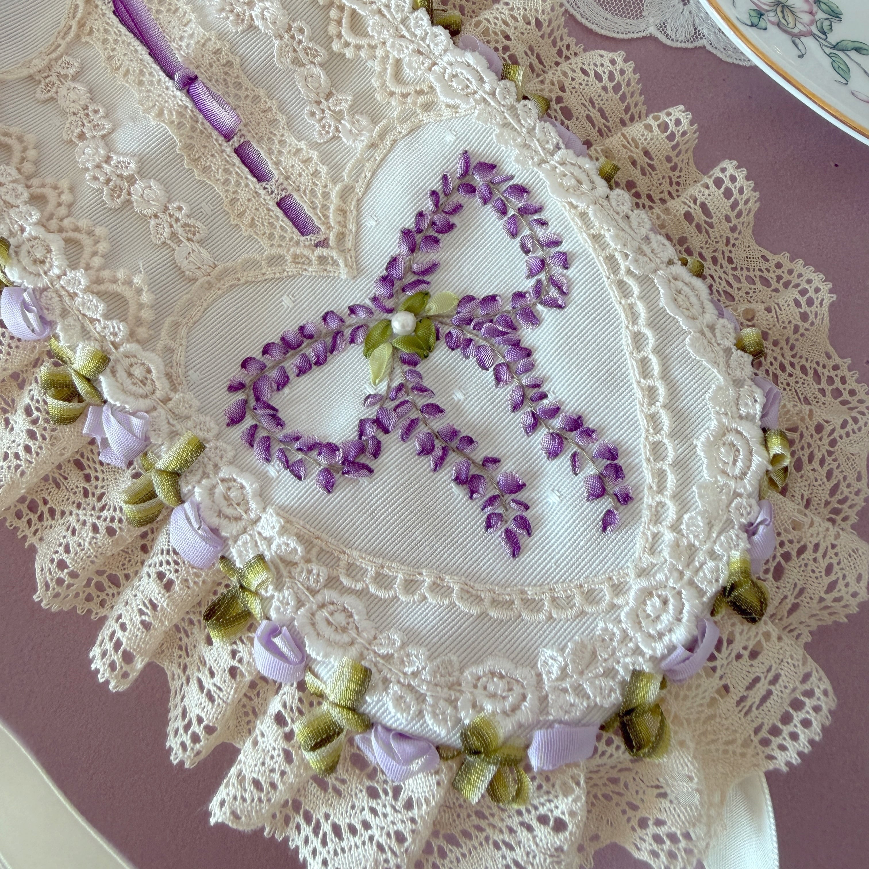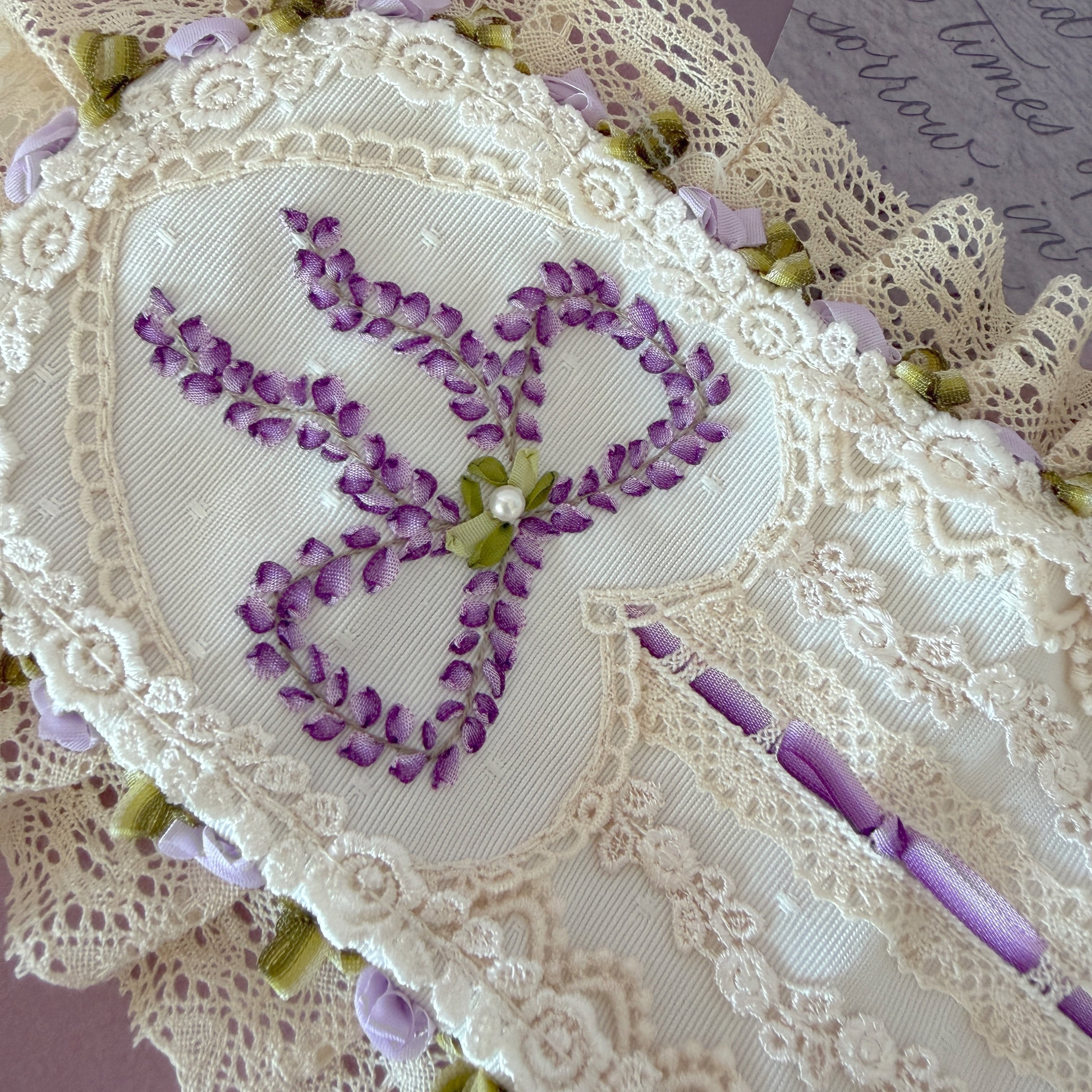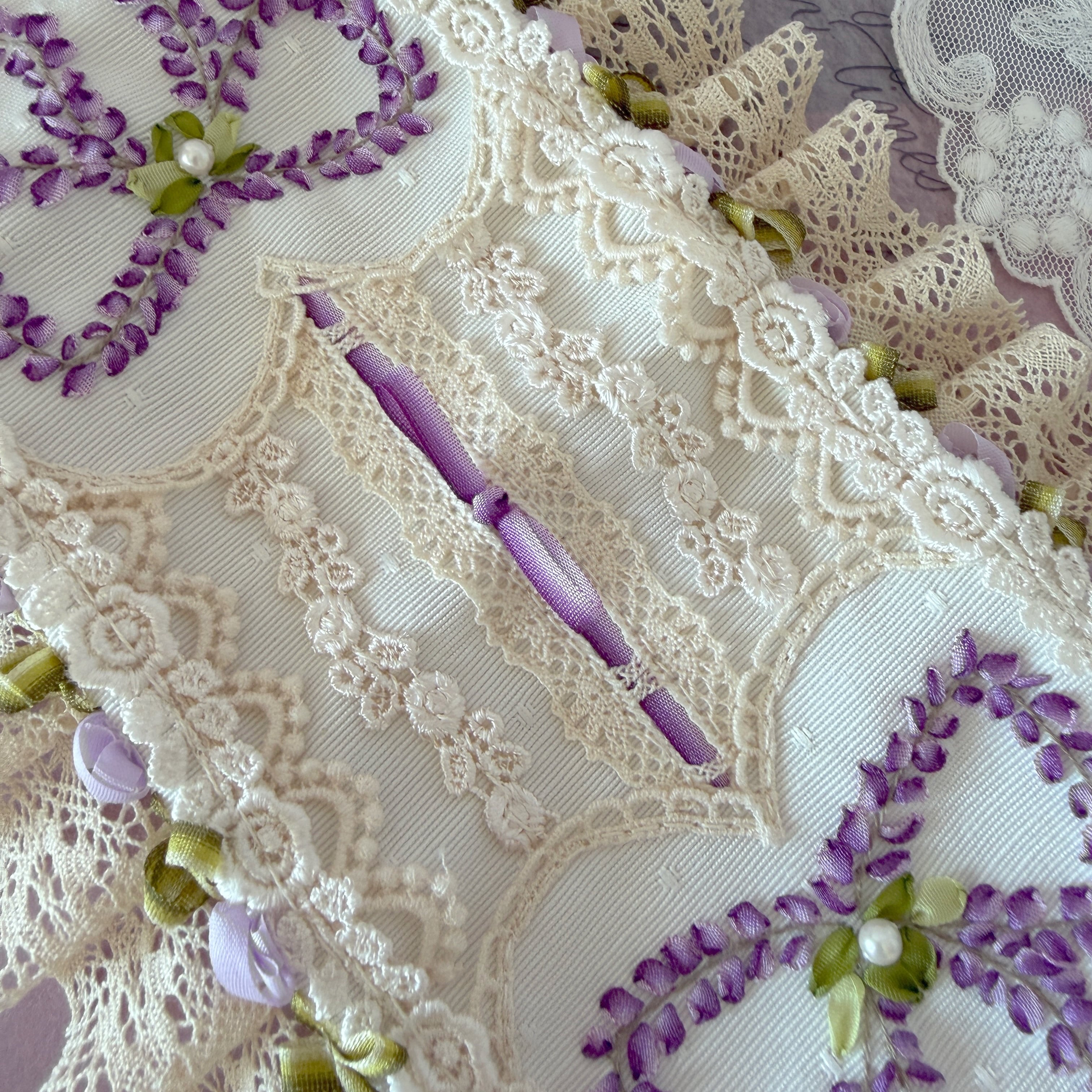 高貴な色として愛されてきた紫。その繊細な濃淡をリボン刺繍のひと針ずつに込め、しだれ落ちる藤の優雅なラインをリボンのデザインで表現しました。